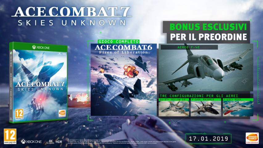 In occasione del Tokyo Game Show 2018, Bandai Namco Entertainment Europe ha annunciato i bonus pre-order, il season pass e la deluxe edition di Ace Combat 7: Skies Unknown titolo disponibile in Italia in versione fisica dal 17 gennaio 2019 per PlayStation 4 e Xbox One.