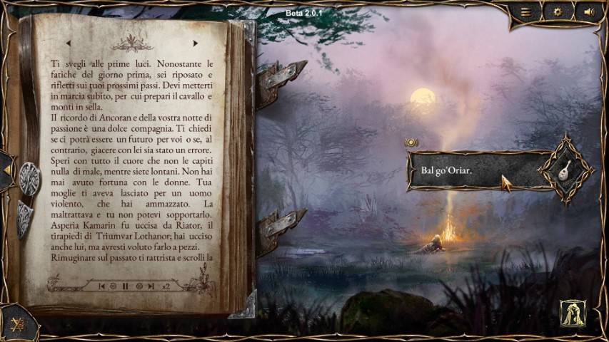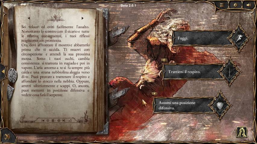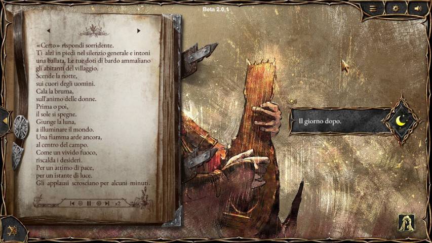 Definire The Ballad Singer è un po’ complicato. Avventura? Si. Gdr? Non proprio anche se… ma è soprattutto un libro game ideato da Riccardo Bandera. Un’evoluzione delle avventure testuali anni ’80. Anche qui abbiamo un testo da leggere ma, grazie all’evoluzione dei tempi, questo testo è anche ed ascoltare e sullo schermo ci sono disegni di grande pregio. Dobbiamo prendere decisioni perché è questo il fulcro del gameplay. Queste decisioni possono effettivamente avere conseguenze più o meno gravi nel proseguimento della storia. E fin dalle fasi iniziali del prologo ne avremo la riprova.