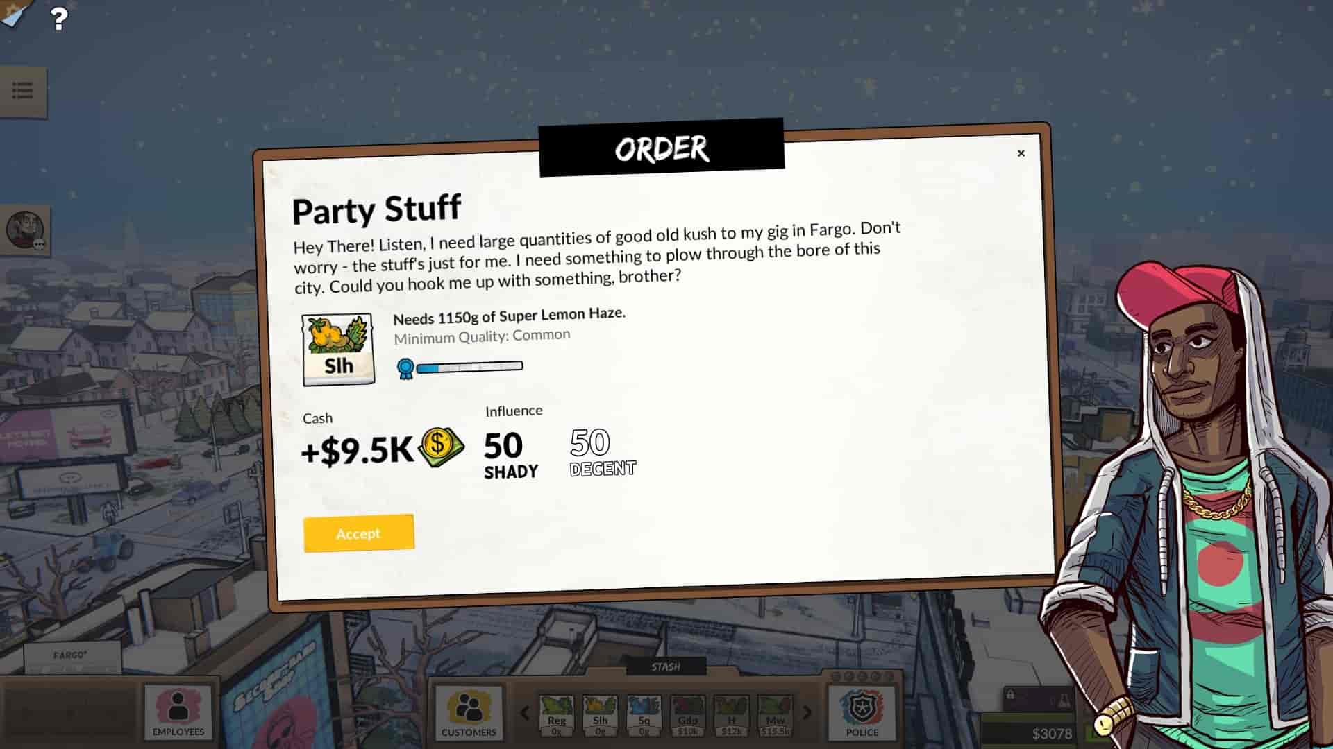 Il titolo si propone, sembrerebbe in assoluta serietà, di esplorare gli aspetti finanziari, politici e culturali legati all’utilizzo, ricreativo e non, di questa particolare pianta. Sarà possibile gestire ogni aspetto della produzione, incluso l’incrocio delle varie specie, l’assunzione di staff e l’inevitabile lotta per il monopolio. Particolare attenzione verrà data agli aspetti politici e sociali della questione, i quali – promette lo sviluppatore – verranno affrontati con la dovuta cognizione di causa.