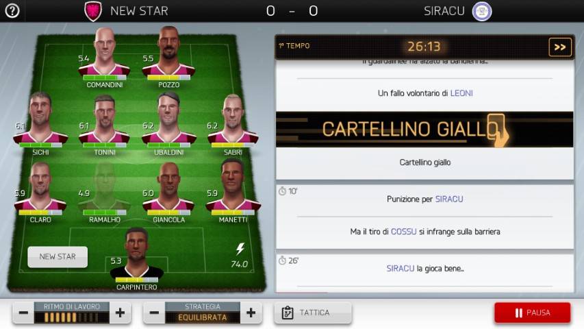 Osservando la rosa potremo mettere mani agli schemi ma cliccando sui giocatori che vengono visualizzato in un modo che ricorda le icone di myClub di PES e di FUT di Fifa, saremo in grado di conoscere tutto sulla storia di quel calciatore, dal livello complessivo (espresso in centesimi), alle eventuali preoccupazioni.