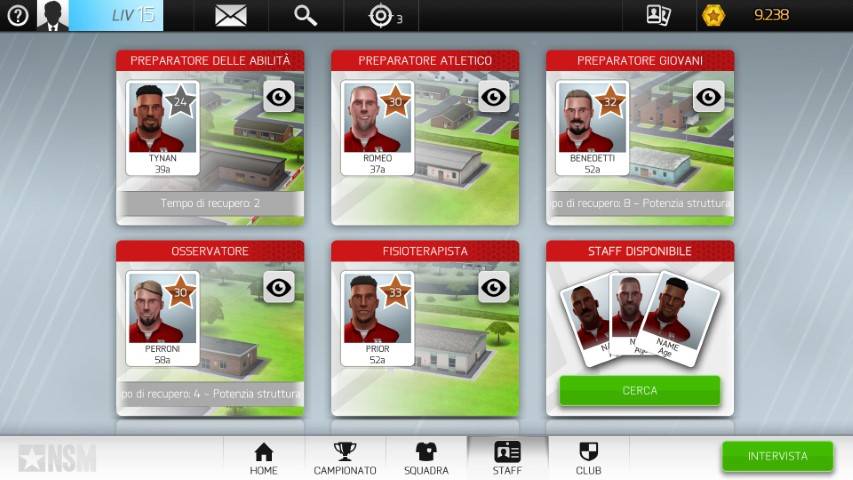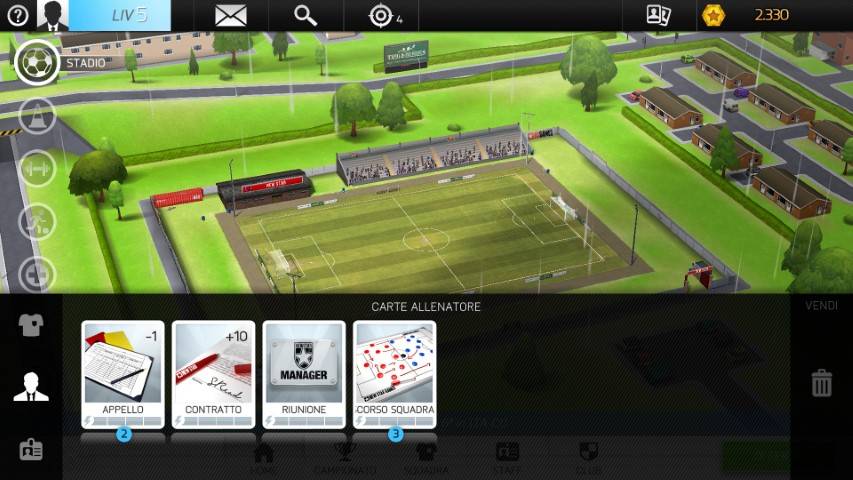 E così via. Ogni struttura ha il suo allenatore di competenza (tranne stadio e merchandise). Abbiamo anche il medico ed altre figure di contorno che danno profondità al gioco. Molto si basa sulle carte da applicare e sulla loro qualità. Più alto sarà il livello della nostra struttura e dei nostri aiutanti, più qualità avranno le carte prodotte da applicare ai nostri singoli calciatori.