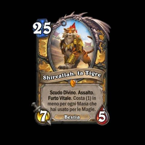 - Per esempio, i Paladini sono stati benedetti dal Loa Shirvallah la Tigre, un servitore Leggendario 7/5 da 25 Mana con Scudo Divino, Assalto e Furto Vitale che costa meno per ogni Cristallo di Mana usato per le Magie.