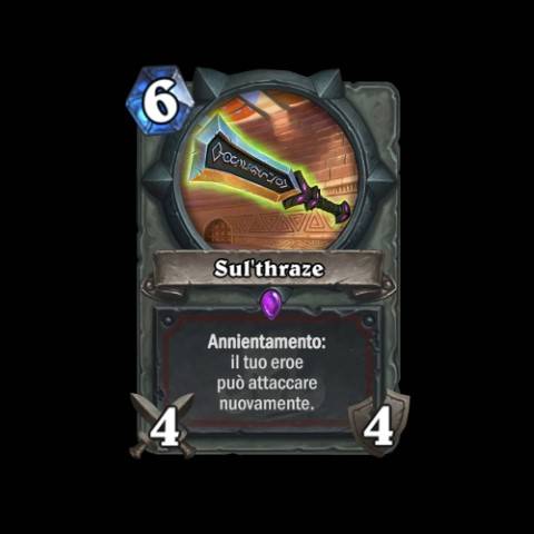 - Un esempio è l’Arma Generica Sul’thraze, una 4/4 da 6 Mana che consente al giocatore di attaccare ancora ogni volta che annienta un bersaglio, fino a esaurimento dell’Integrità dell’Arma.