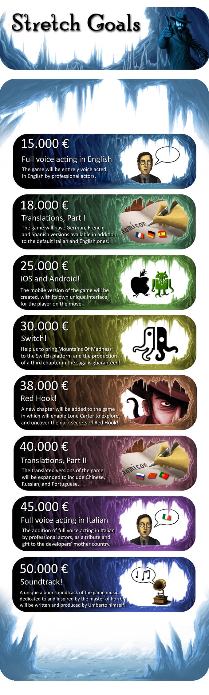 L’obiettivo minimo di 10.000 euro è stato raggiunto un paio di giorni fa. Adesso gli sviluppatori rendono noti gli altri stretch goal con l’obiettivo massimo di raccogliere i fondi per la realizzazione del gioco per iOS, Android e Switch e dedicarsi alla realizzazione di un capitolo addizionale ispirato al racconto intitolato L’orrore a Red Hook.