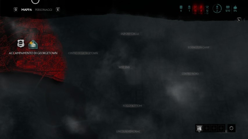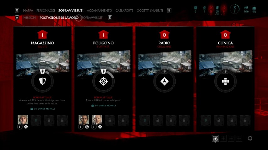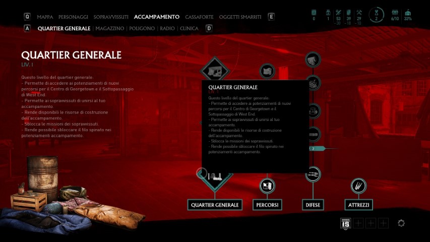 Una buona parte del gameplay di Overkill’s: The Walking Dead è quella che possiamo definire, mappa tattica. Sulla mappa, troveremo i distintivi che andranno a contraddistinguere le varie missioni da intraprendere, quelle che daremo in pasto ai nostri sopravvissuti che porteranno utili risorse all’accampamento, e il menù di potenziamento dell’accampamento stesso. Questo menù in particolare, è fondamentale per continuare nel gioco.