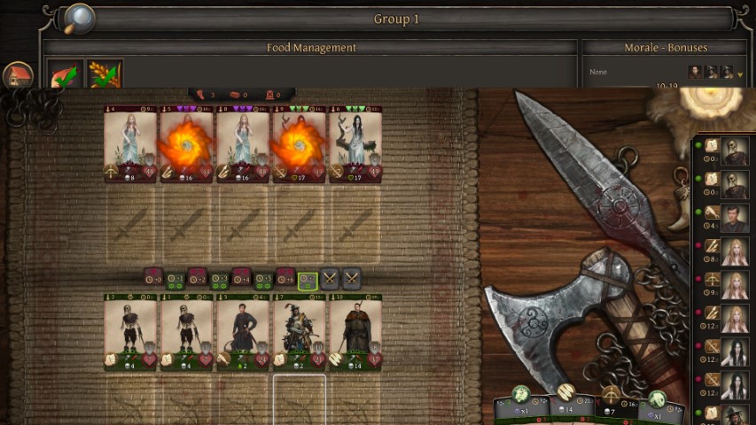I combattimenti rappresentano una buona fetta dell’esperienza di gioco. All’inizio di ogni combattimento il campo di battaglia si presenterà come una classica plancia dove andremo a “posare” le nostre carte. A turno, giocatore e nemico decideranno quali personaggi far entrare “in gioco”, il loro posizionamento, quali abilità usare se disponibili, e anche tipi di attacco differenti. Ad esempio, il martello pesante ha un “range” di ben 5 caselle (a forma “T” rovesciata) mentre una mazza può danneggiare solo il nemico che si ha di fronte. Al termine del posizionamento di tutte le unità e dopo che i “turni di preparazione” sono finiti, si passerà alla risoluzione della battaglia. Se la battaglia iniziale non dovesse portare ad avere un vincitore, si continuerà con le carte rimaste in vita fino a che uno dei due contendenti avrà la meglio.