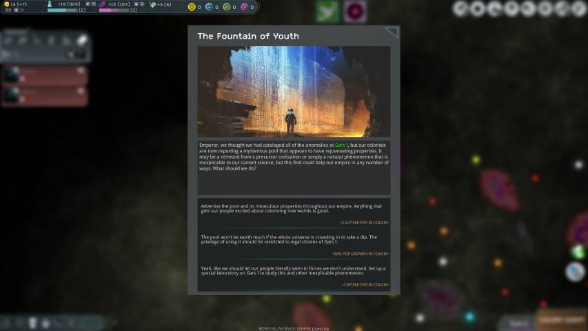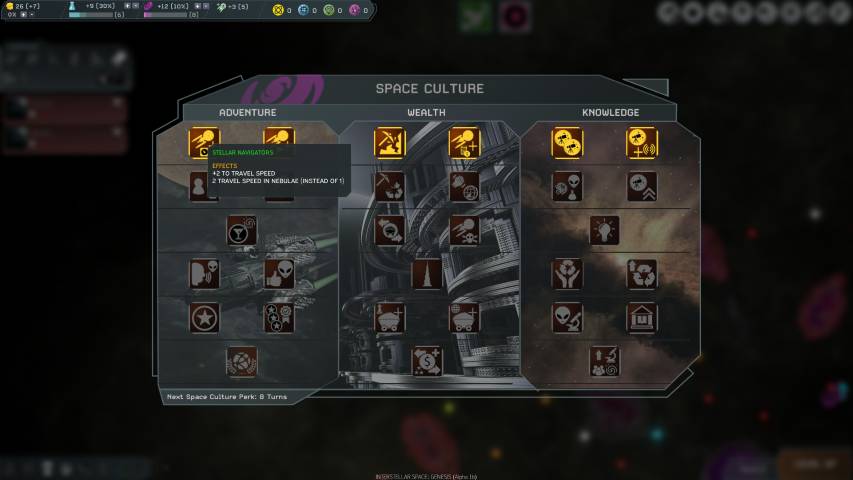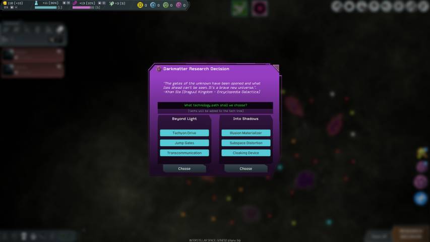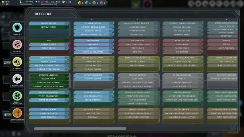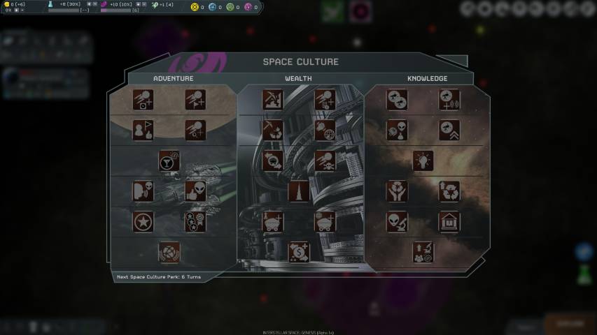 In alto a sinistra, avremo una schermata riepilogativa molto completa dove troveremo l’ammontare della nostra tesoreria, i punti ricerca utili per sviluppare nuove tecnolgie, i punti cultura che ci serviranno per acquisire alcune abilità quali ad esempio quella di permetterci un viaggio più veloce tra le stelle, e poi le risorse: Elio, Antimateria, Neutronio e Materia Oscura.