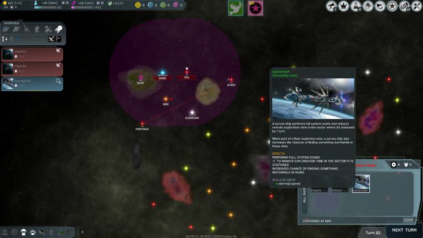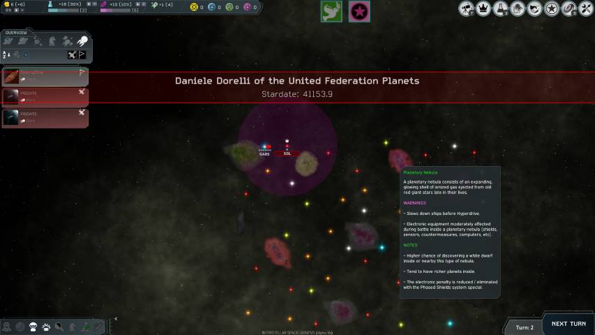 Le cose da fare sono davvero moltissime, ma grazie ad una schermata panoramica posta sulla sinistra dello schermo, avremo un colpo d’occhio sui pianeti da noi colonizzati, i pianeti scoperti, flotte e risorse strategiche. Questa schermata andrà però rivista poiché con l’avanzare dei turni di gioco, la gestione dei pianeti ma soprattutto quella delle flotte risulta al momento un po’ confusionaria, e bisogna prenderci la mano. Ci auguriamo che nelle future versioni venga resa più snella, così da permetterci un pieno controllo del nostro impero senza impazzire per cercare questa o quella nave.