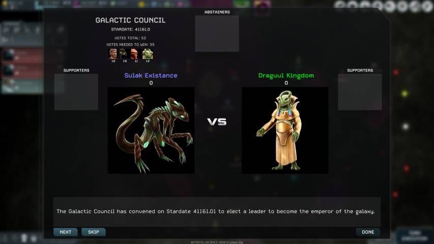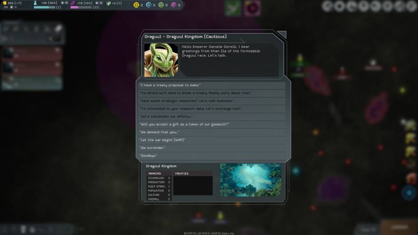 Presto o tardi incontreremo una delle altre razze che abitano la nostra galassia di gioco. Come in tanti altri 4X, ci verrà data l’opportunità di proporre trattati commerciali e minerari, collaborazioni sulla ricerca scientifica, e ovviamente trattati di pace nel caso fossimo in guerra con questa o quella fazione. Il dialogo è fondamentale, ma se siamo in condizioni di forza, può non essere un male cercare di acquisire qualche tecnologia o moneta sonante da una delle razze con cui interagiamo.