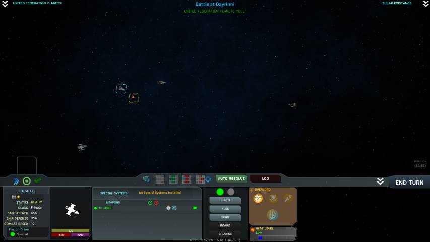 Quando entreremo in una zona nemica o incontreremo qualche creatura spaziale che non vede l’ora di fare delle nostre navi il suo pranzo, si andrà in battaglia. La visuale cambierà fornendoci una schermata in 2d dove muoveremo le nostre navi e potremo usare le armi a nostra disposizione per colpire il nemico. Anche in questo caso, il tutto sarà scandito da turni.