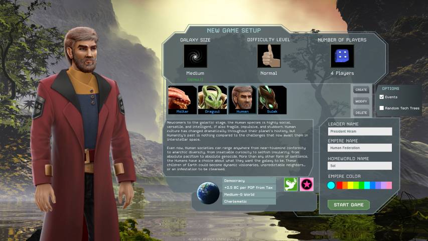 Avviato il gioco e scelto nuova partita, la prima scelta che dovremo compiere sarà quella della razza con cui prenderemo parte alla nostra conquista spaziale. In questa alpha abbiamo 4 razze, ognuna, naturalmente, con le sue peculiarità ed una caratterizzazione ben precisa, utile ad immedesimarci al meglio nel contesto di gioco.