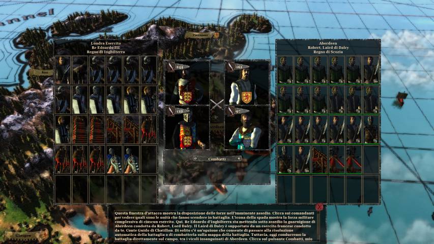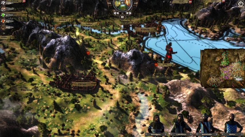 Come in altri grand strategy games, la mappa europea è ben rappresentata nel suo contesto storico. In alto troviamo i dati relativi al mese, all’anno, e abbiamo anche il susseguirsi delle stagioni (con tutti i malus/bonus che comporta al movimento delle truppe e durante le battaglie). A sinistra abbiamo i dati relativi alla tesoreria, ossia alla “vil moneta”. Elemento indispensabile che ci permetterà l’addestramento di truppe ed il miglioramento dei nostri possedimenti, quelli relativi agli introiti e alle spese di mantenimento, l’ammontare delle entrate dovute al commercio, ed il pulsante che ci permetterà di riscuotere le entrate delle tasse. In basso, oltre ad una mini-mappa, troveremo i consiglieri.