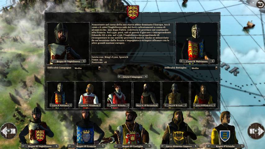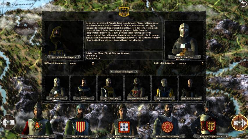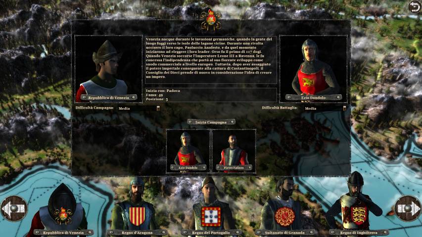 La modalità campagna riprende ciò che abbiamo visto nei tutorial, ma prima di iniziare dovremo scegliere una delle fazioni a nostra disposizione. Sacro Romano Impero, Regno d’Inghilterra, Regno di Francia, persino la Repubblica di Venezia. C’è davvero molta scelta, un peccato non vedere la Repubblica di Genova, quella di Pisa, quella di Amalfi. Speriamo vengano aggiunte in futuro! Deciso il nostro impero, potremo anche scegliere l’eroe che andremo ad impersonare, che potrà avere più o meno “fama”.