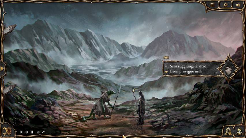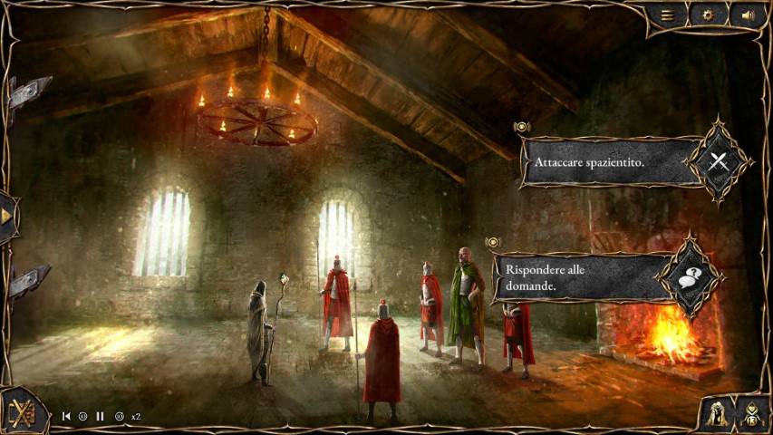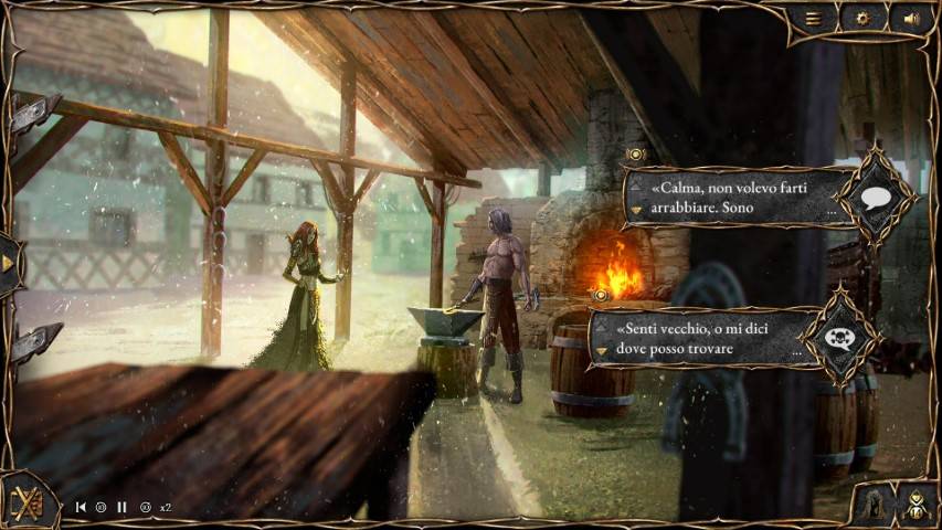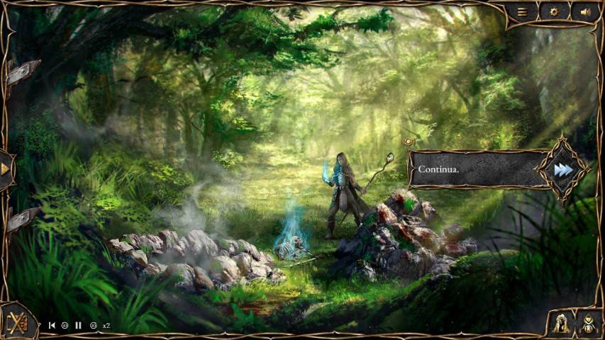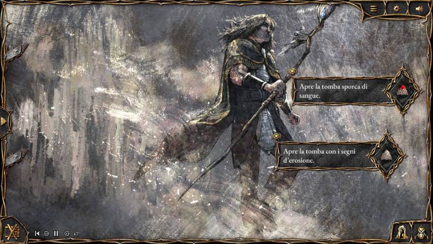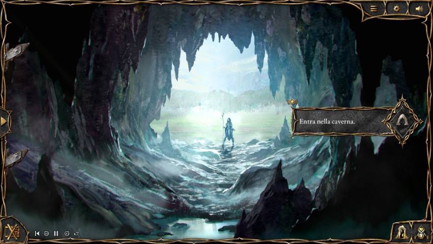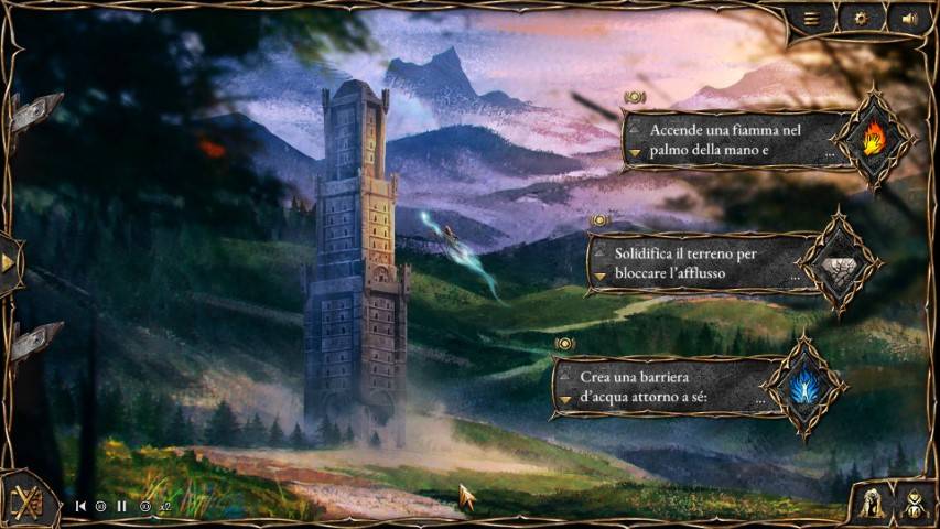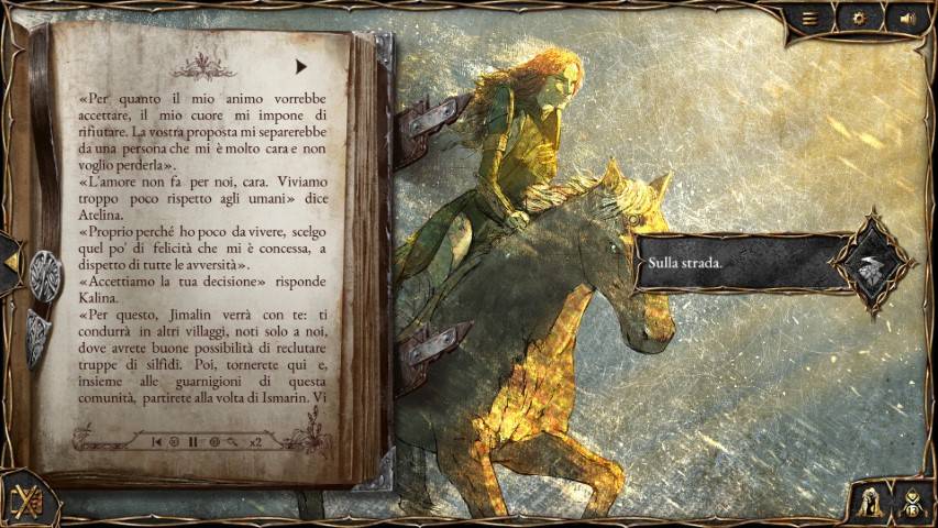 Ottima anche l’interfaccia: chiara, semplice, efficace: a sinistra le pagine del libro col testo della storia, sotto i vari pulsanti con i quali potremo velocizzare la lettura del narratore (fino a raddoppiarla) ed ovviamente la possibilità di girare le pagine. A destre le opzioni da scegliere. Un applauso a Federico Musetti, autore di queste scene che ci immergono letteralmente in un contesto che ricorda quello tolkeniano.