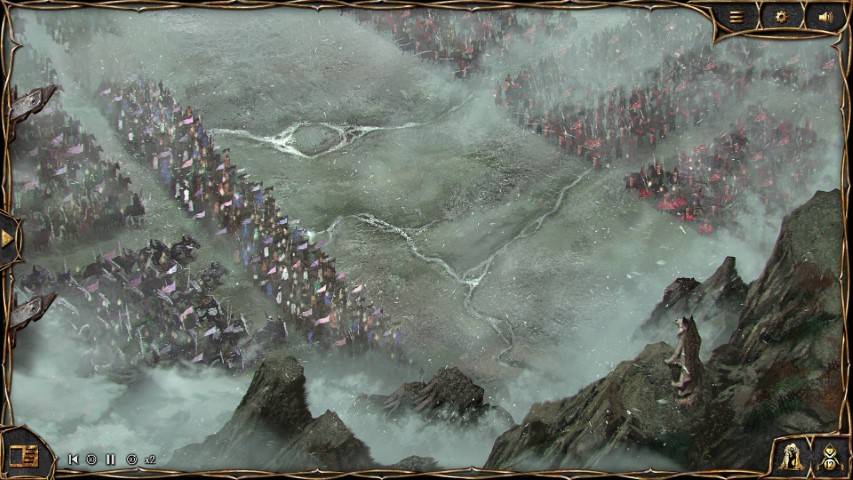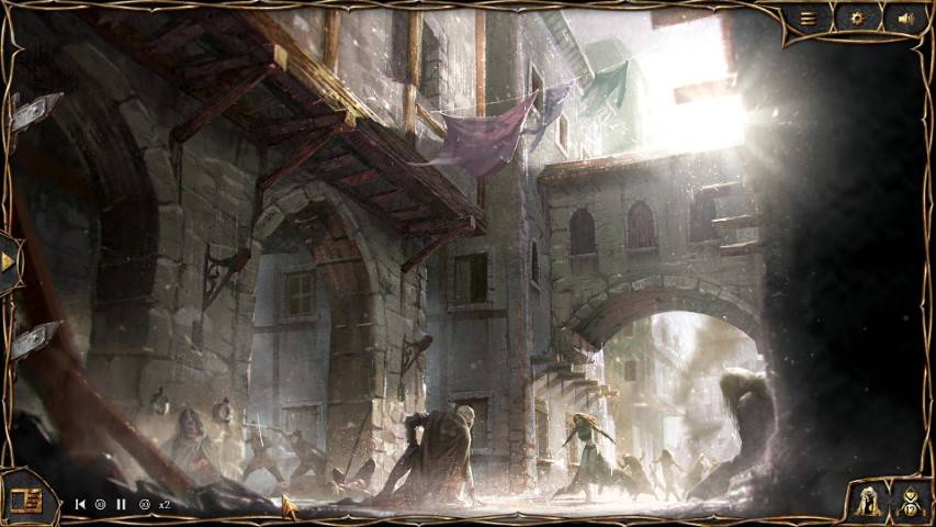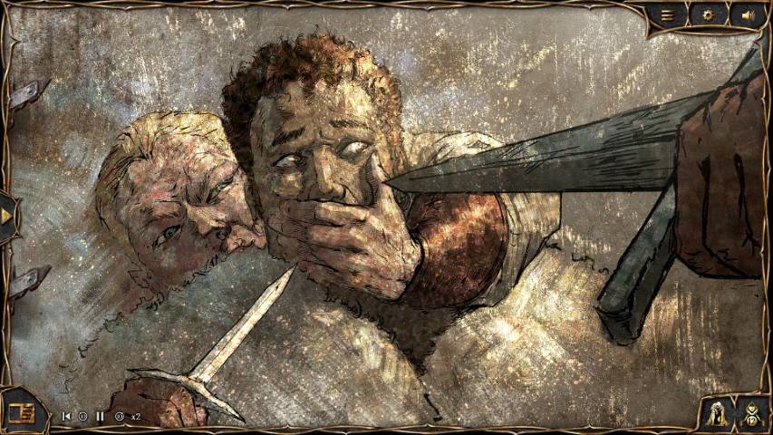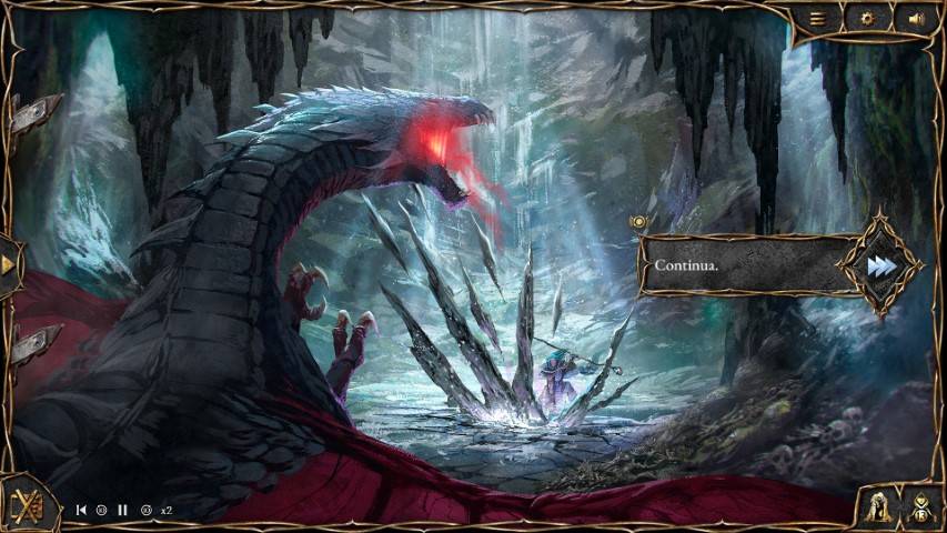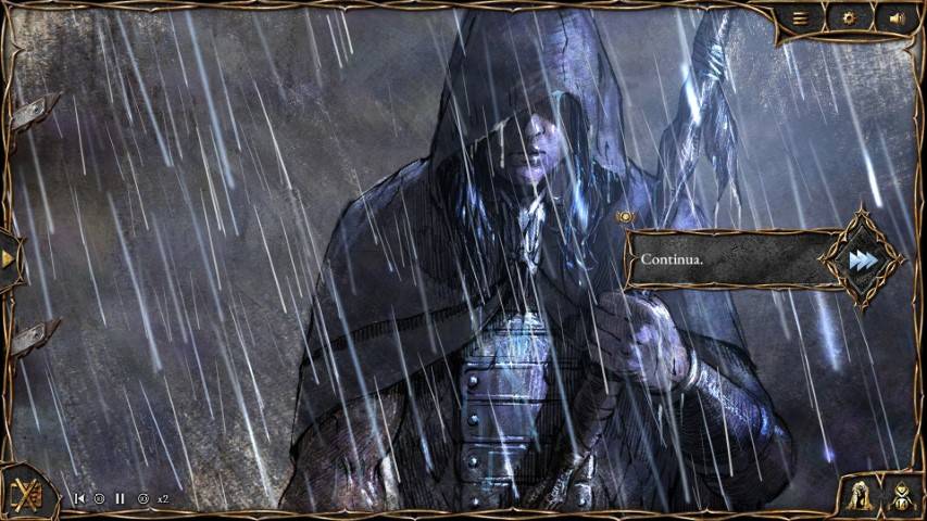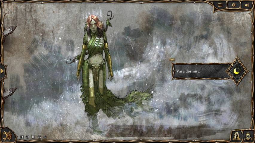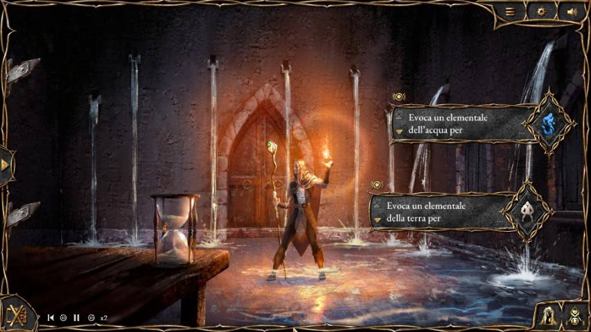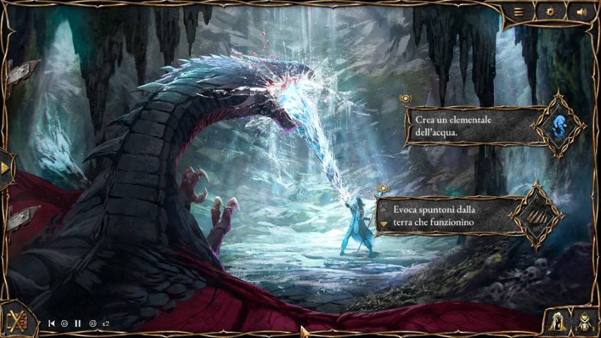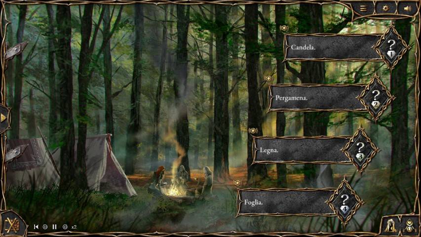 Ottima anche l’interfaccia: chiara, semplice, efficace: a sinistra le pagine del libro col testo della storia, sotto i vari pulsanti con i quali potremo velocizzare la lettura del narratore (fino a raddoppiarla) ed ovviamente la possibilità di girare le pagine. A destre le opzioni da scegliere. Un applauso a Federico Musetti, autore di queste scene che ci immergono letteralmente in un contesto che ricorda quello tolkeniano.
