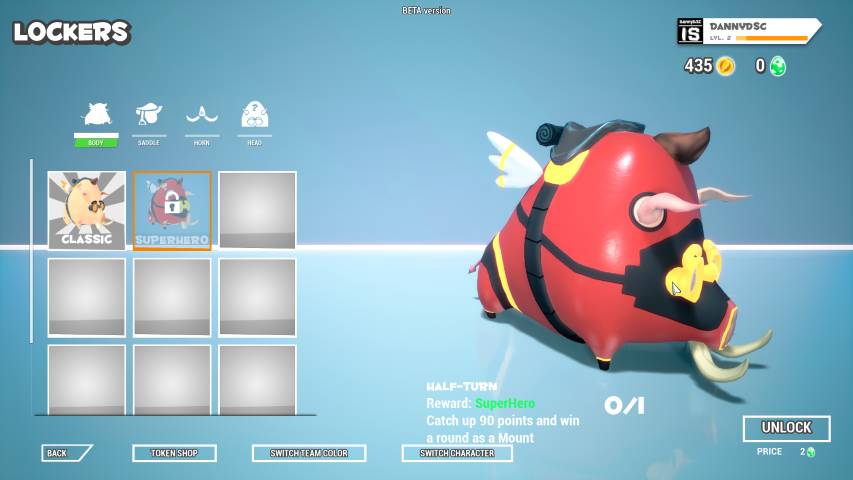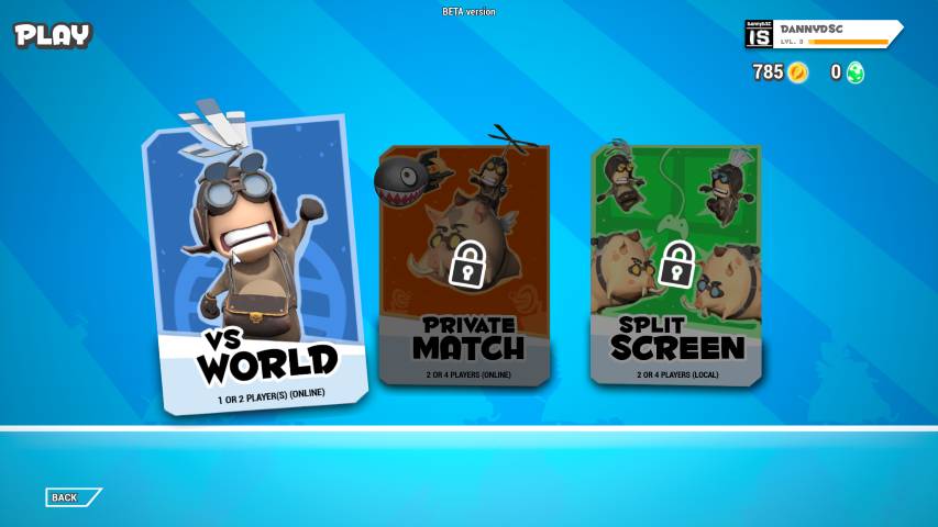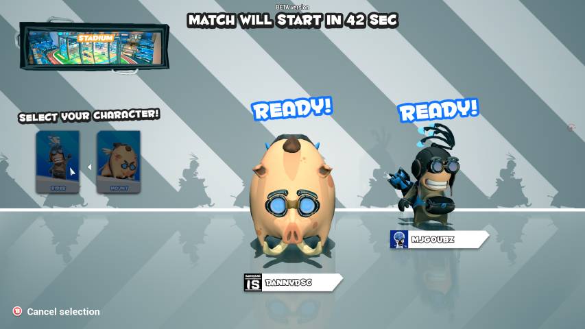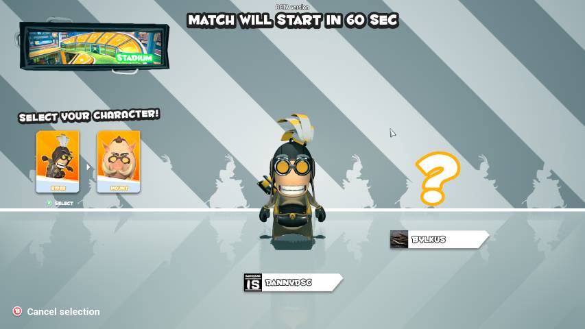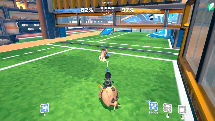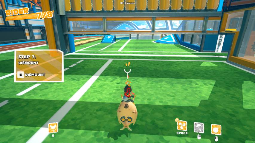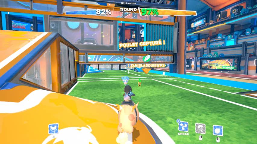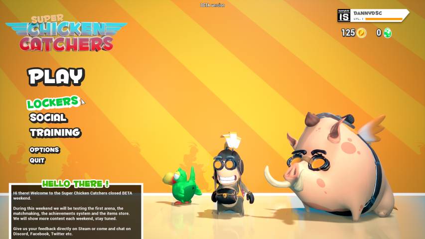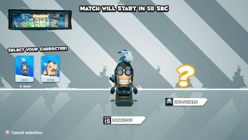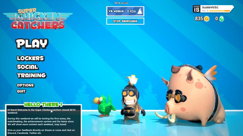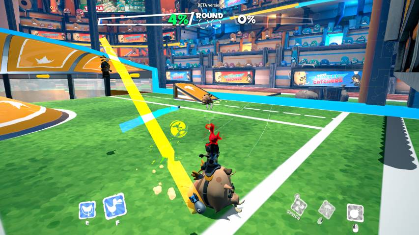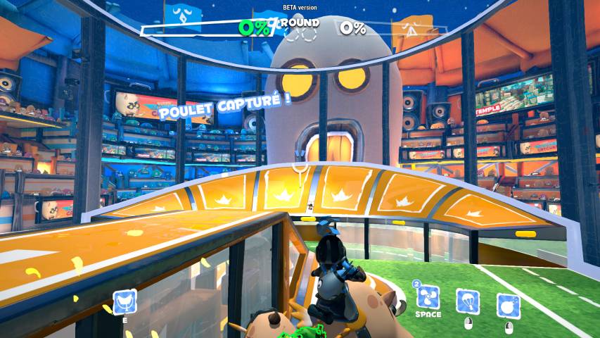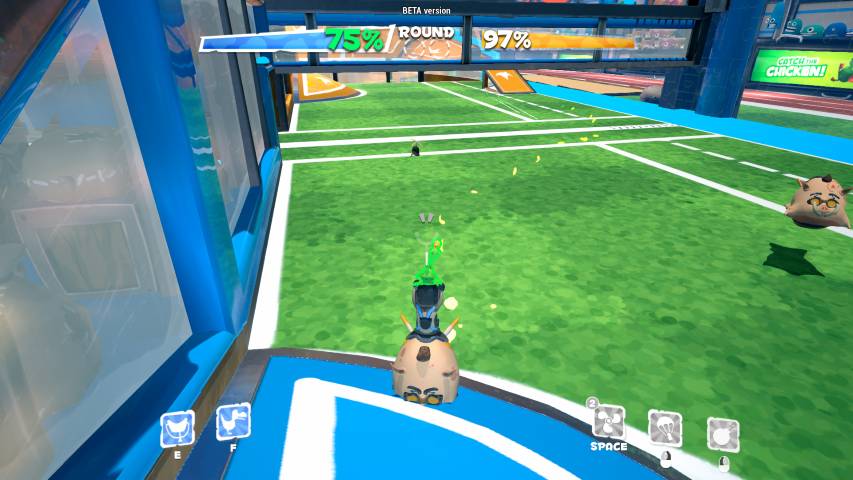 Ogni sessione di Super Chicken Catchers parte con la scelta del tipo di partita, del proprio alter ego (raider o monta), e del colore (al momento sono disponibili solo il giallo ed il blu). In questa prima beta, è disponile solo la modalità VS World, con 2 squadre da 2 giocatori ciascuna, per un totale di quattro. Match privati e split screen saranno disponibili in seguito. Finito il countdown, parte la “corrida”.