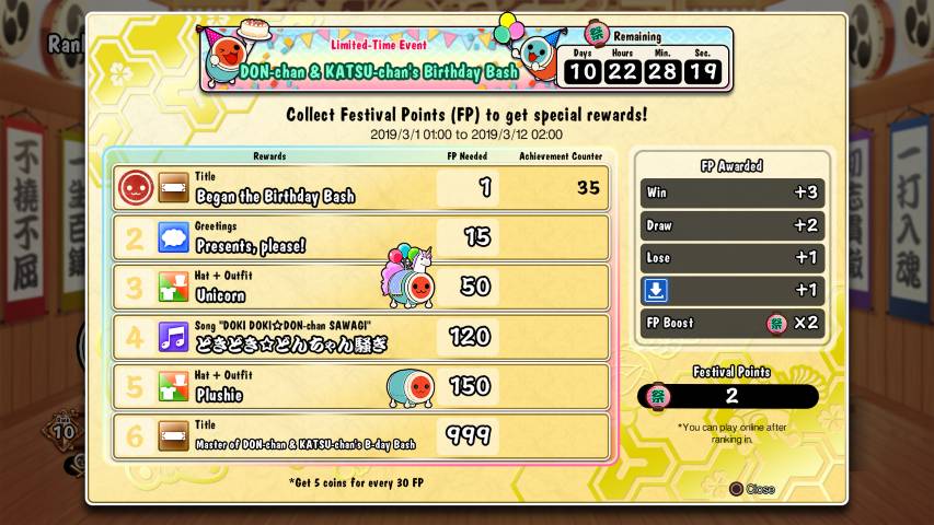 Dalle 10 e fino allo stesso orario di martedì 12 marzo, i giocatori possono partecipare all’evento classificato online intitolato “DON-can & KATSU-chan’s Birthday Bash”.