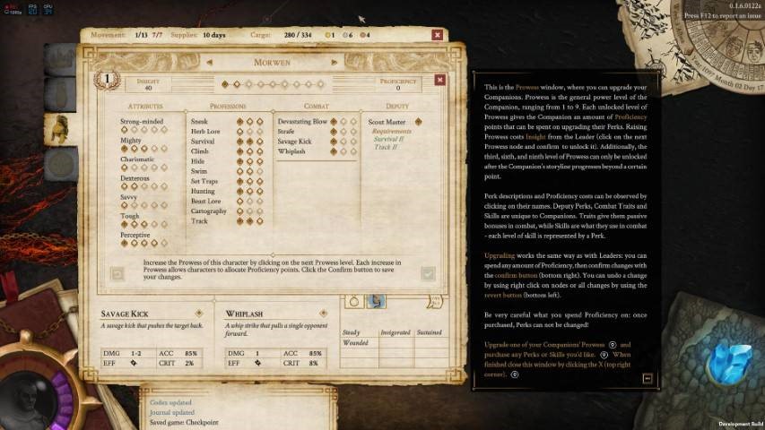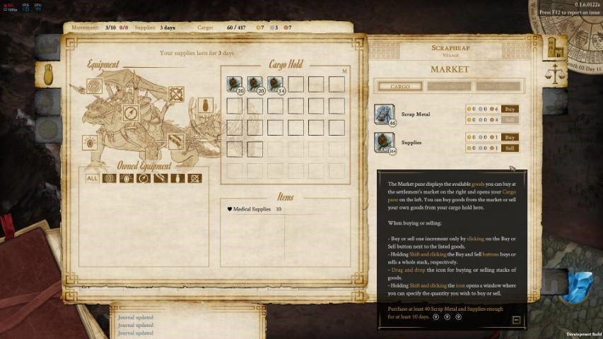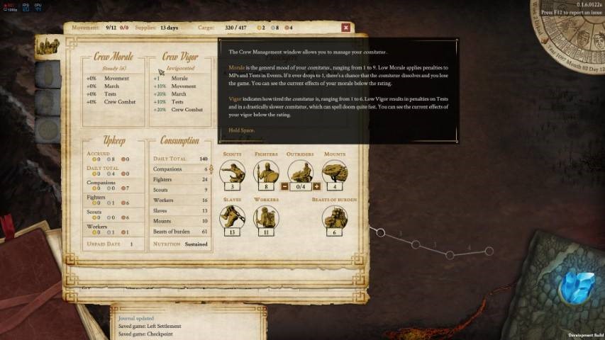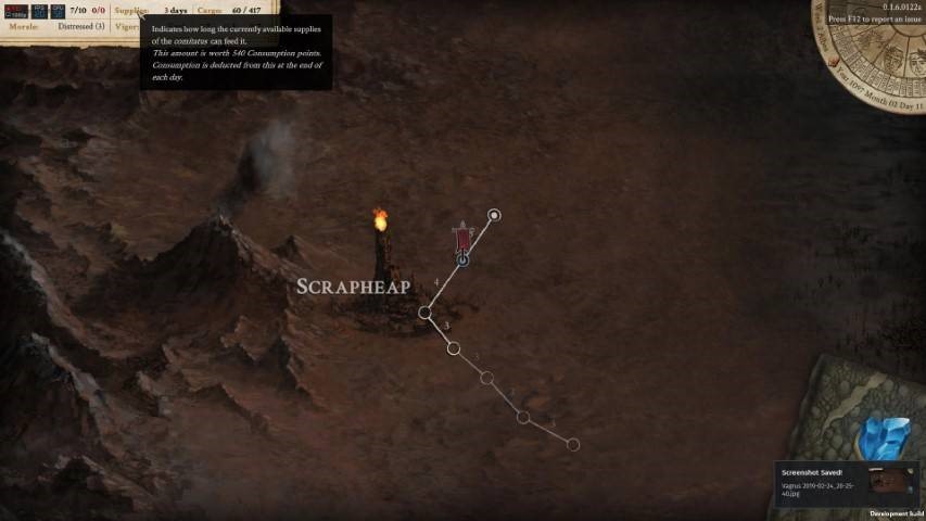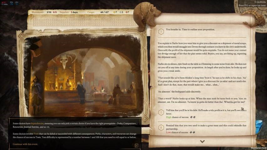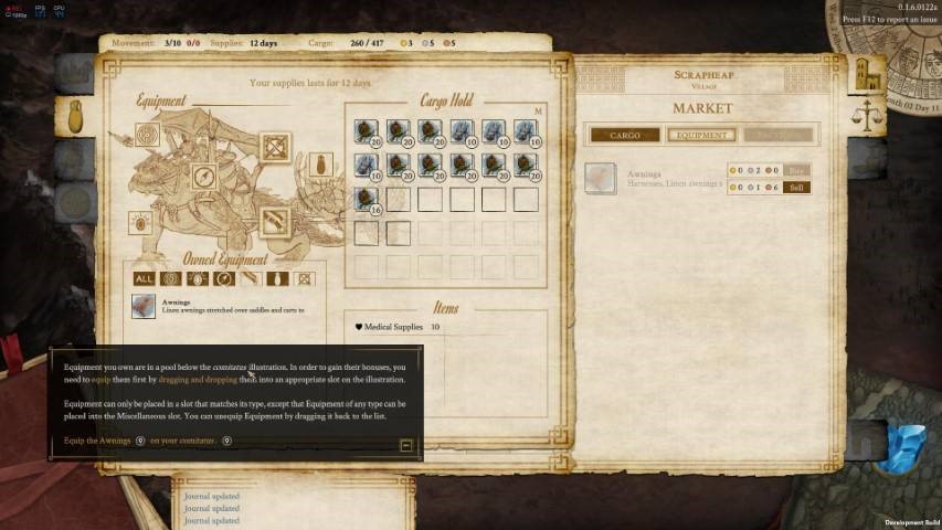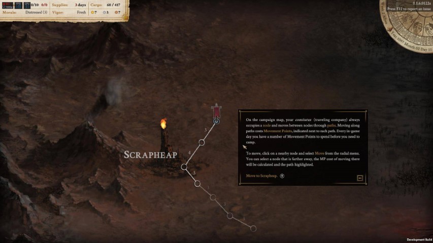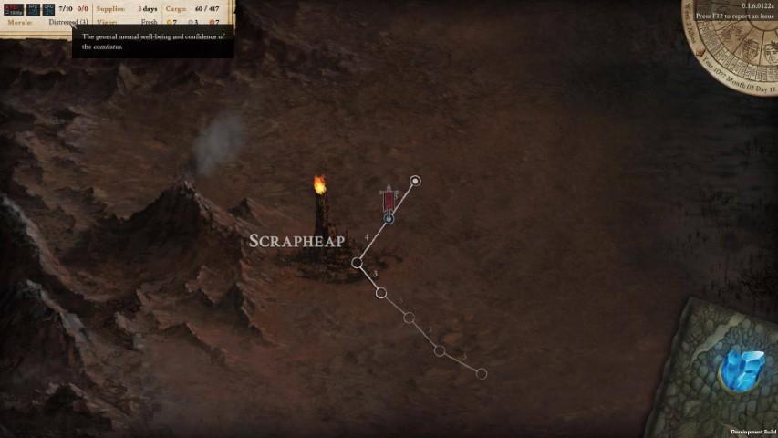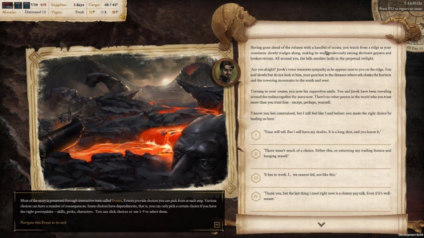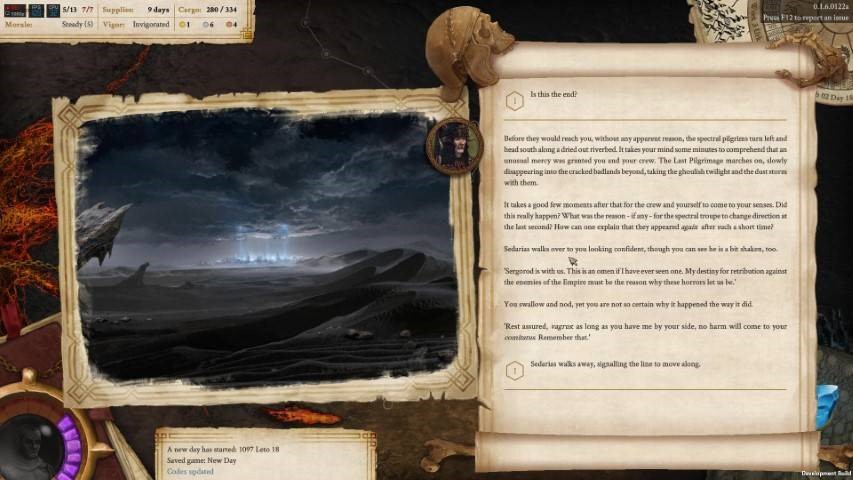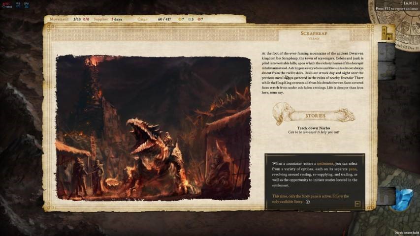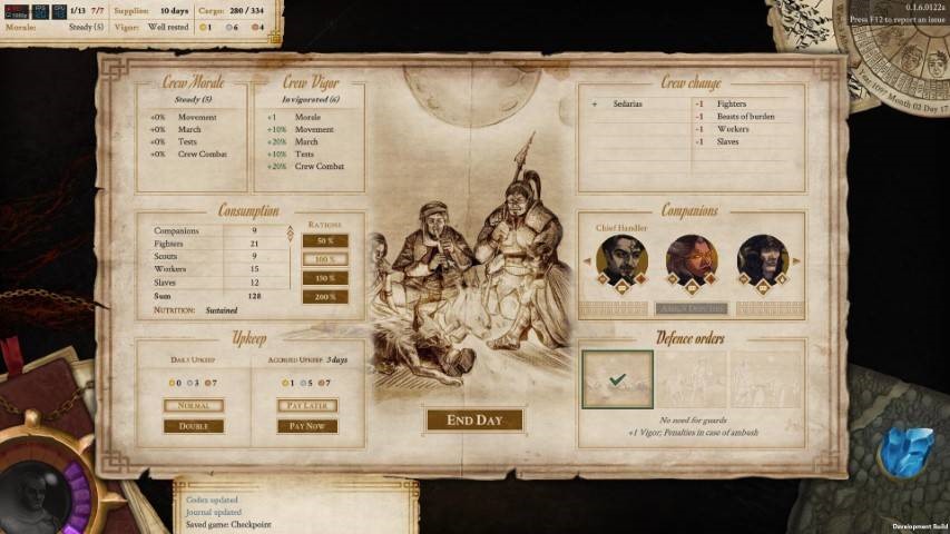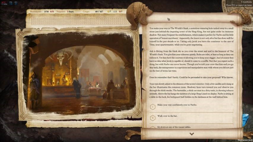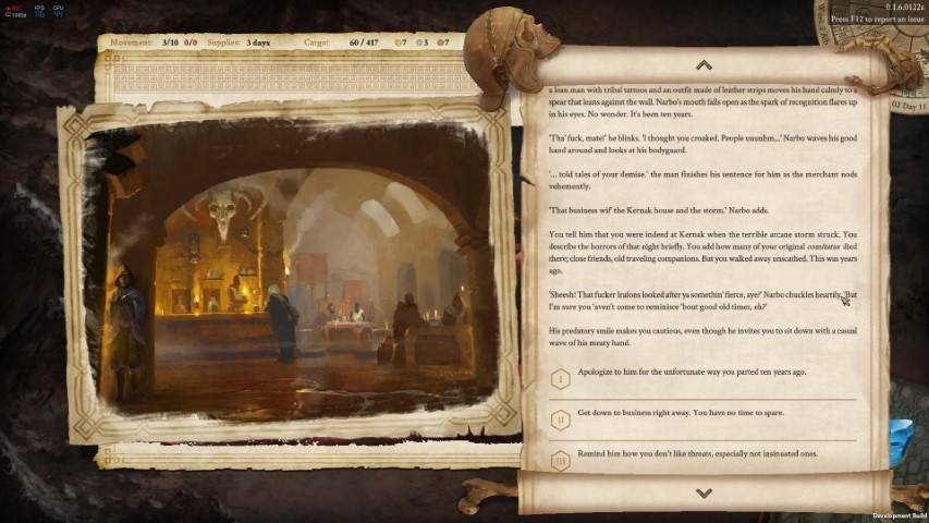 Ad ogni turno, potremo decidere di quanto far muovere il nostro seguito, fermandoci per la notte al termine dei punti movimento. Il muoversi della carovana, porterà il nostro eroe a confrontarsi con situazioni impreviste, il più delle volte pericolose, dialogare con i propri compagni, finanche al campo di battaglia, ma andiamo con ordine. Dopo aver imparato a muovere e gestire il riposo della nostra carovana (con un menu molto chiaro che ci permetterà di gestire il cibo che daremo ai nostri commensali, pagare i nostri guerrieri, scambiare due parole con il nostro party), arriveremo alla volta della prima città.