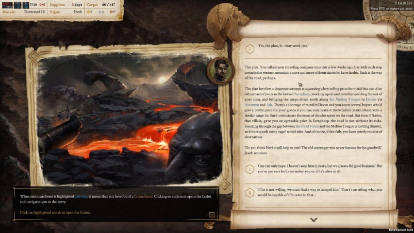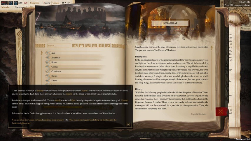 Qui, torna il “libro-game”, con lunghi dialoghi e scelte multiple, e una schermata relativa agli approvvigionamenti dove acquistare cibo e materiali. Avremo anche il classico diario, dove poter consultare le varie “quest”, ed una mappa del continente, davvero molto ampia dobbiamo dire. Lasciata la prima città con provviste, un carico da vendere, ed un incarico da portare a termine, il continuo del nostro viaggio verrà scandito dalle schermate del tutorial. Queste ci illustreranno fra l’altro un compendio (dove potremo consultare miti, regioni, luoghi, personaggi, parole relativi all’ambientazione), e il menu relativo alla carovana.