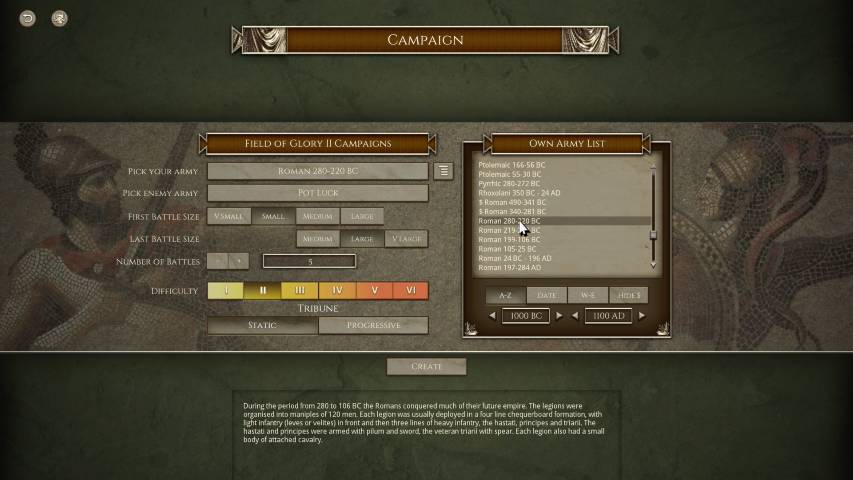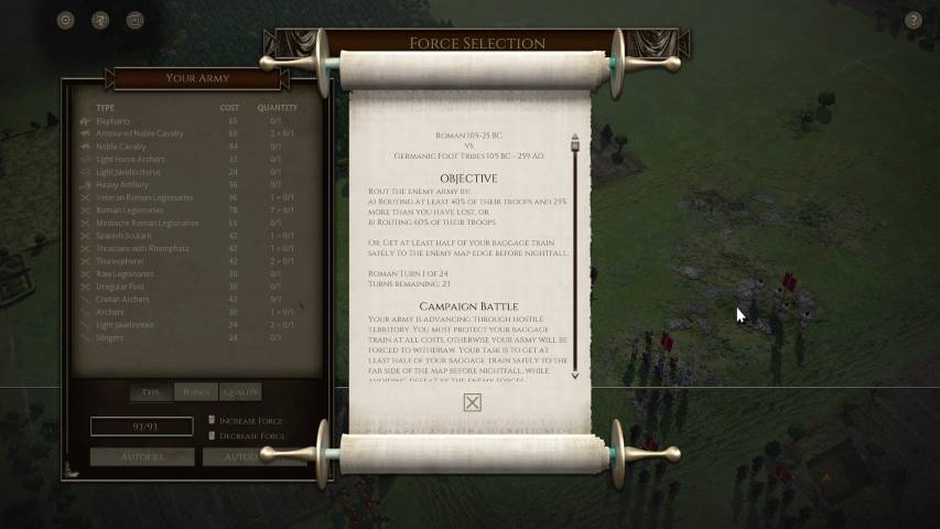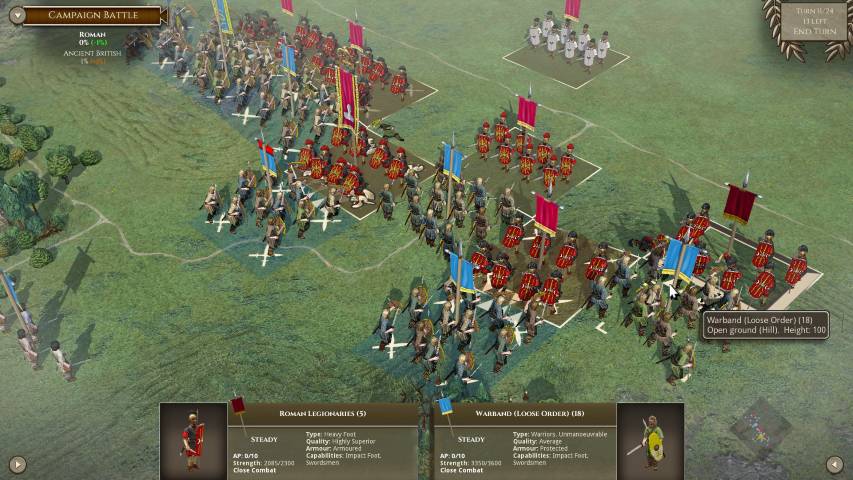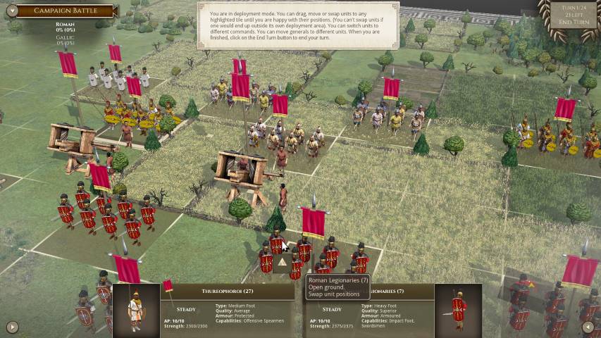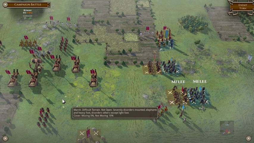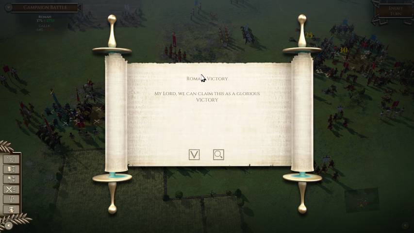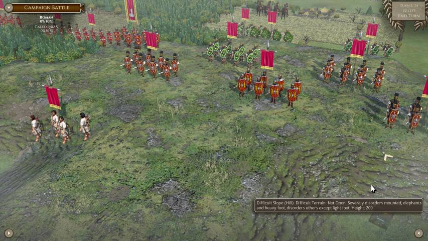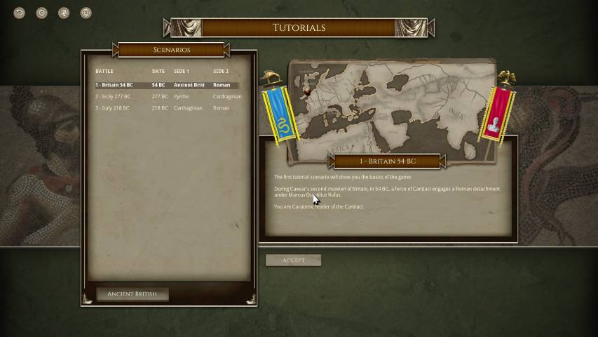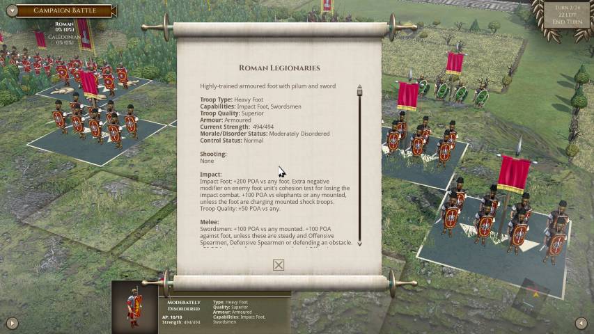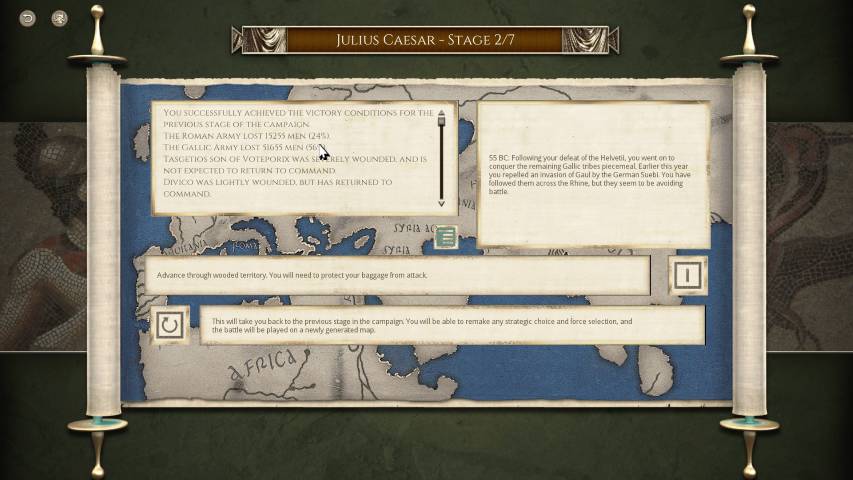 Avviato il gioco, sarà molto utile fiondarci sul tutorial che ci introdurrà ai tipi di truppe, al posizionamento e alle altre varie meccaniche, grazie a tre scenari di differente difficoltà. Avremo poi una serie di campagne dinamiche dove potremo impersonare vari protagonisti storici tra i quali Giulio Cesare (e la sua epopea di conquiste in Gallia), Annibale, Mitridate VI, o una serie di battaglie singole personalizzate. Il numero di scenari è sconfinato, e ce n’è per tutti i gusti. Unica mancanza, sono gli scontri navali, ma è normale considerando che parliamo della trasposizione del gioco da tavolo.