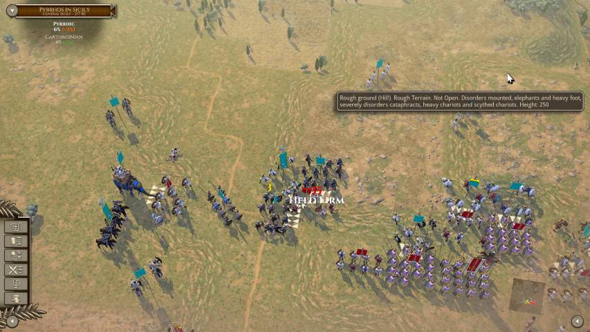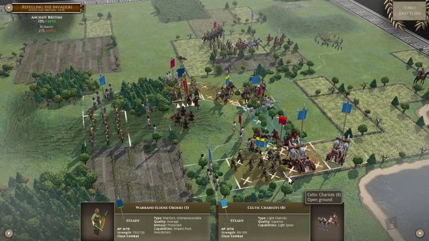 La mappa, divisa in quadrati, non è colma di campi di grano, colline, foreste, solo per bellezza. Ogni quadrato, ogni tipo di terreno, porta in seno una serie di bonus o malus a seconda dell’unità che posizioneremo. Per dire, usare gli arcieri in campo aperto contro una falange romana, porterà la nostra truppa in rotta in un turno, forse due. Al tempo stesso, una unità di cavalleria che attacca al fianco dei soldati leggeri armati del solo giavellotto, sarà micidiale. Insomma, Field of Glory II vuole a tutti i costi portare il giocatore a “pensare” come un generale che deve gestire le proprie truppe (chiamarla simulazione potrebbe non essere un coraggioso azzardo).