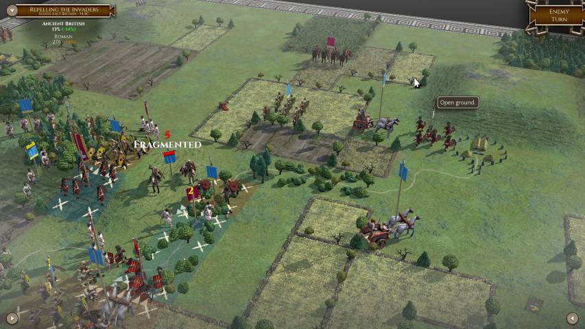 Questo perché ogni unità ha un numero limitato di punti azione (movimento/attacco), quindi anche il solo “girarla” per posizionarla di fronte al nemico porta via un punto, spesso impedendo di muoverla per quel turno. Durante la fase di pianificazione della difesa e dei futuri attacchi, ci siamo anche soffermati sui vari terreni, così da posizionare un gruppo di arcieri su una piccola collina, ed un’unità di fanteria nascosta nella foresta pronta a sorprendere il nemico nella pianura sottostante.