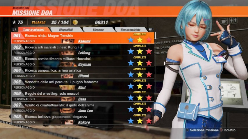 Il sistema è un po’ confusionario e più di una volta si fa fatica a seguire la storia, che appare pertanto più sconclusionata di quella che è realmente. A maggior ragione considerando che altri frammenti del racconto si possono ottenere attraverso dei file disponibili nella modalità Missione DOA. Quest’ultima consiste in una serie di sfide a difficoltà crescente, in cui bisogna raggiungere specifici obiettivi per guadagnare delle stelle che a seconda del caso servono a sbloccare costumi e oggetti, oltre che far progredire nella sessione e portare a nuove sfide.