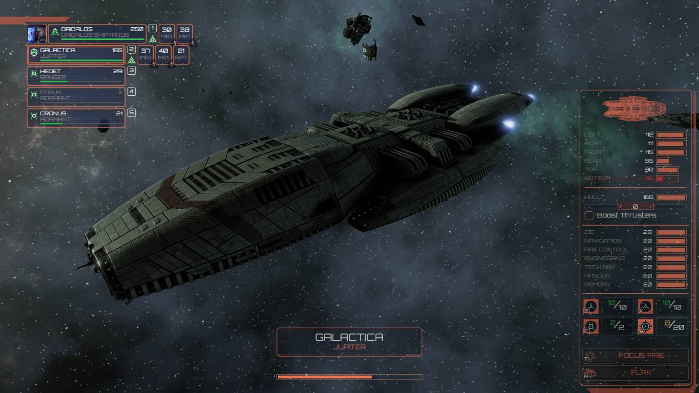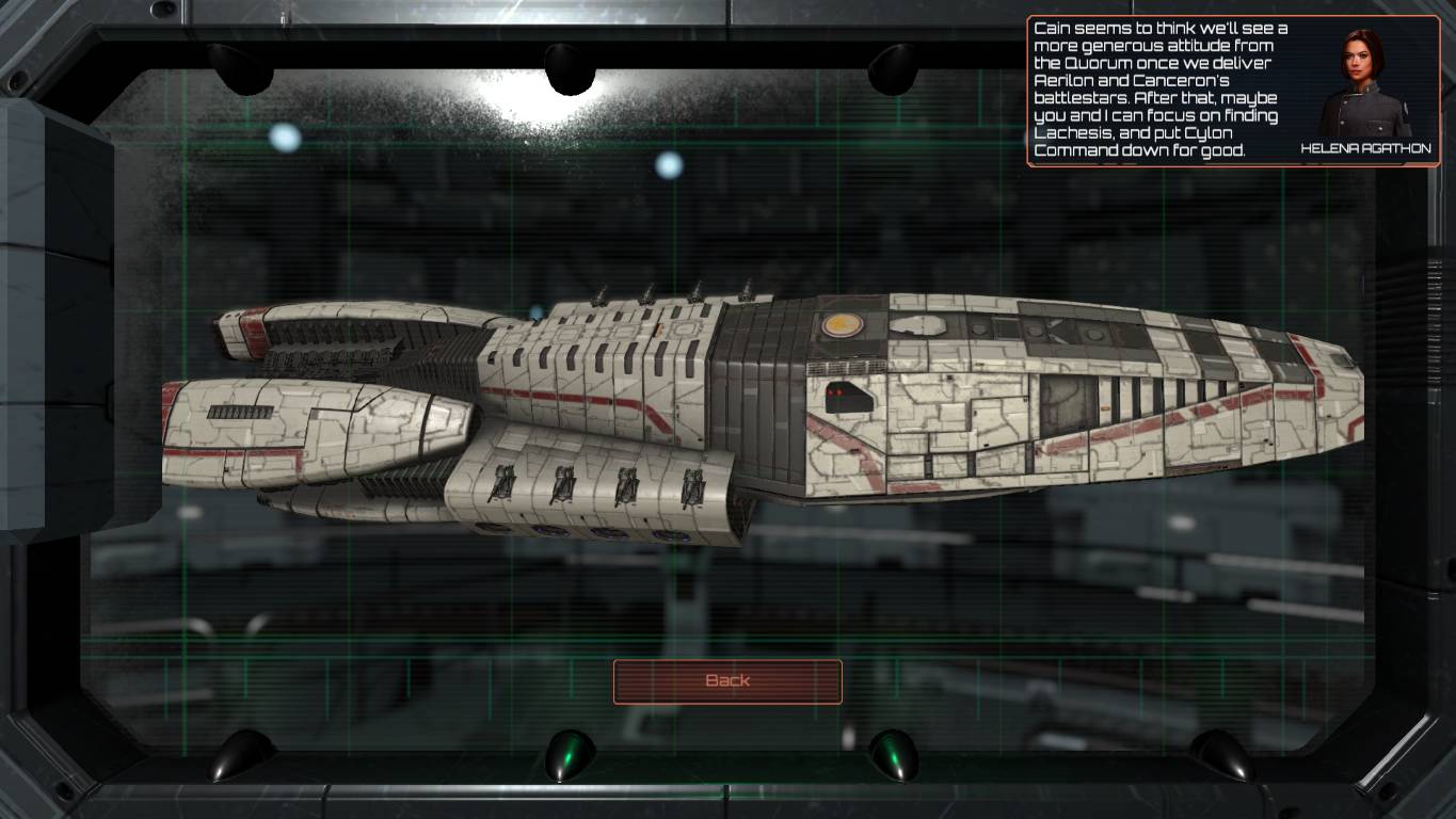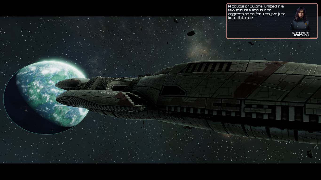 Avere la Heracles o il Galactica dalla nostra, non sarà un timbro automatico sul successo di una missione, anzi. La miglior scelta è cercare di far si che l’ufficiale in comando acquisisca esperienza con scaramucce di breve durata (magari risolte automaticamente con l’apposita opzione) in modo da poter comandare una flotta più ampia. È importante avere più di una flotta a pattugliare lo spazio delle 12 colonie, poiché i cyloni attaccheranno spesso, e questo è un ottimo espediente per far livellare tutti i nostri ufficiali. Rispetto ai precedenti dlc, Anabasis compreso, qui le battaglie sembrano davvero più difficili, e quando il Gorgon cylone entra in gioco, può sconvolgere ogni equilibrio.