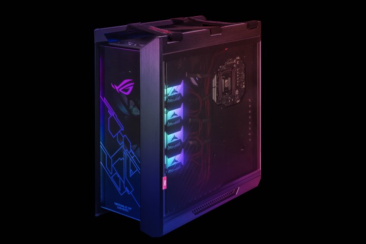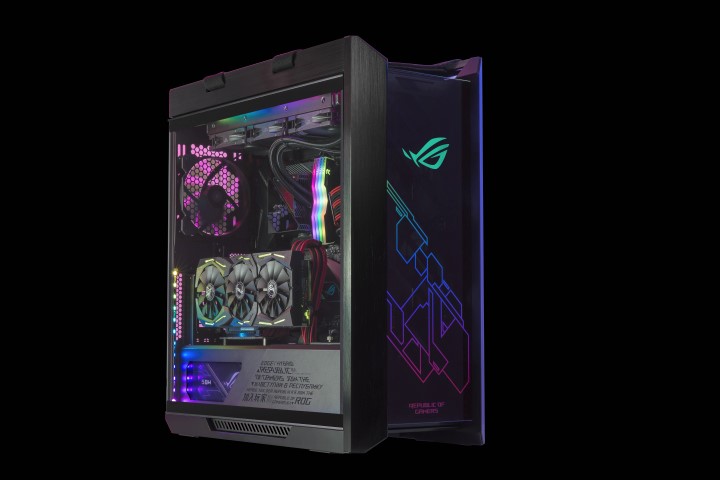 Le operazioni di intervento e manutenzione di ROG Strix Helios sono davvero molto semplici. Il pulsante di sblocco posteriore permette di aprire lateralmente i pannelli per accedere rapidamente e senza ricorso a strumenti aggiuntivi all’interno del case. I pannelli sono agganciati alla base e rimangono in sede, leggermente divaricati rispetto allo chassis, per poter conseguentemente essere rimossi completamente. Il case offre inoltre ampi alloggiamenti per installare ventole e radiatori, anche quelli più generosamente dimensionati, oltre che filtri rimovibili sul fronte e nella parte superiore ed inferiore al fine di proteggere più efficacemente l’interno dalla polvere.