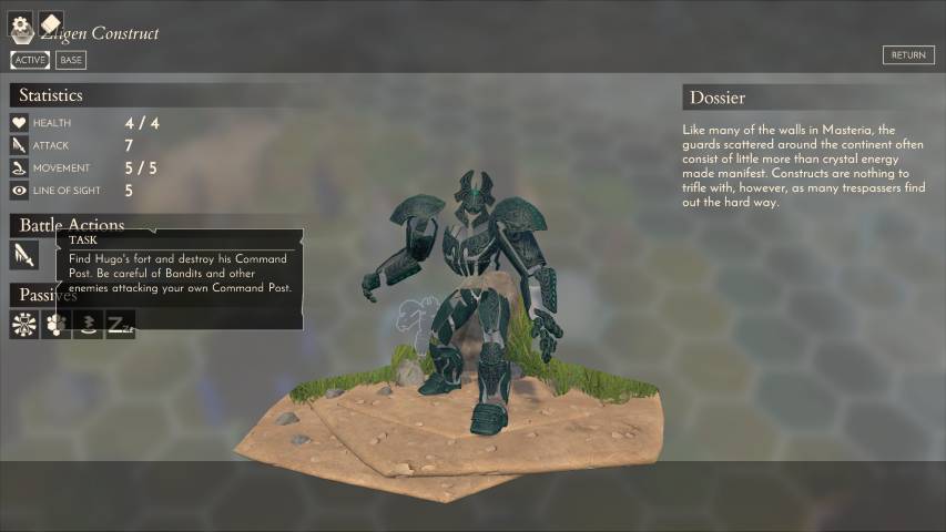 Le prime tre caratteristiche si spiegano da sole. La linea di tiro, invece, rappresenta il numero di esagoni che una determinata unità scorge davanti a sé. Ogni unità può anche avere diverse abilità attive o passive, quali ad esempio l’immunità alla fatica, un bonus alla costruzione degli edifici, o una durata di turni entro il quale la creatura sparirà dalla mappa di gioco, come per esempio i Costrutti, o Golem.