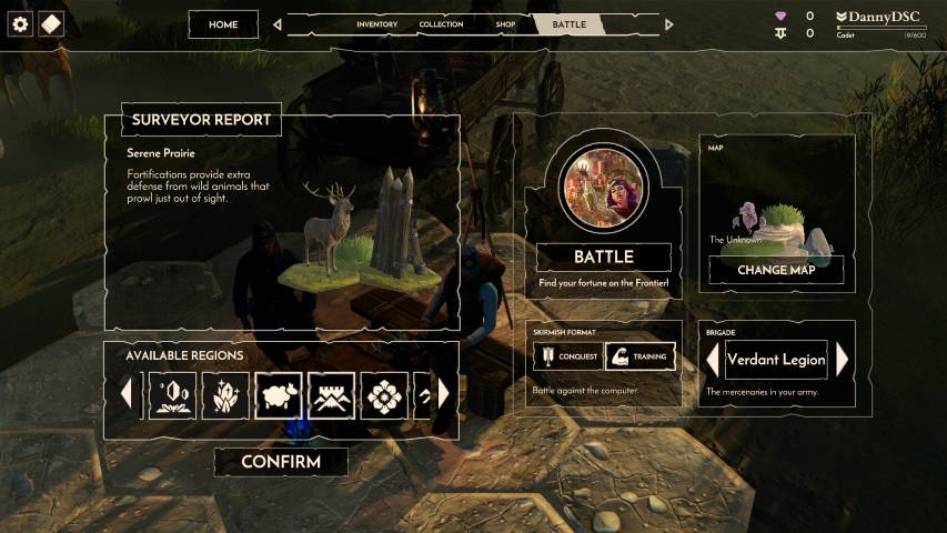 Ci verrà affidato un campo base, che potremo anche migliorare, con unità da reclutare e persino un negozio, ma andiamo con ordine. A sinistra del nostro campo base abbiamo l’inventario del nostro personaggio, utile per fornire bonus che saranno attivi già dall’inizio della battaglia. La tenda del reclutamento ci permetterà di gestire il mazzo che dovrà essere composto da almeno 30 carte, una delle quali un capitano, nostro sottoposto che guiderà la nostra compagnia durante la battaglia.
