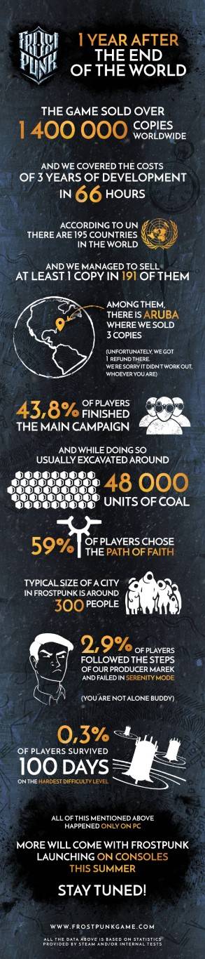 Importante risultato raggiunto da Frostpunk. 11 bit studios ha infatti ufficializzato che il suo strategico post-apocalittico ha superato quota 1,4 milioni di copie vendute in tutto il mondo.