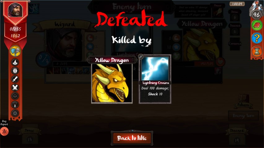 Il combattimento poteva volgere a nostro favore, se avessimo tenuto un pugnale che ci garantiva l’uso di una carta aggiuntiva per turno. L’acquisto di una spada che donava ad ogni attacco danni da fuoco ci sembrava strategicamente utile, ma in questo particolare caso ha decretato la nostra disfatta. Il bello è che ad ogni run, si impara sempre qualcosa.