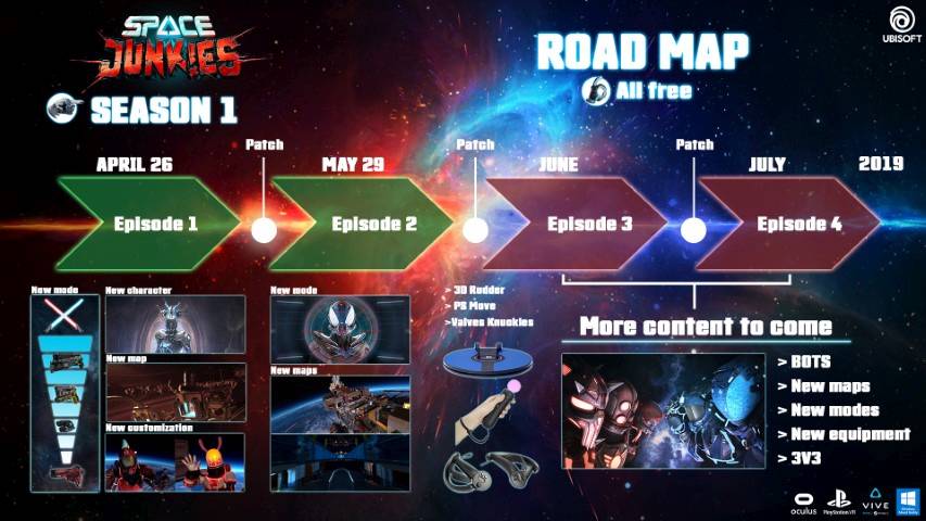 Nel corso dell’intera Stagione 1, Space Junkies continuerà a ricevere nuovi aggiornamenti con contenuti gratuiti, che includeranno nuove modalità di gioco, personaggi, mappe e molte altre sorprese. I nuovi contenuti arriveranno con un approccio stagionale, con ciascuna stagione che conterrà quattro episodi distribuiti ogni 16 settimane.