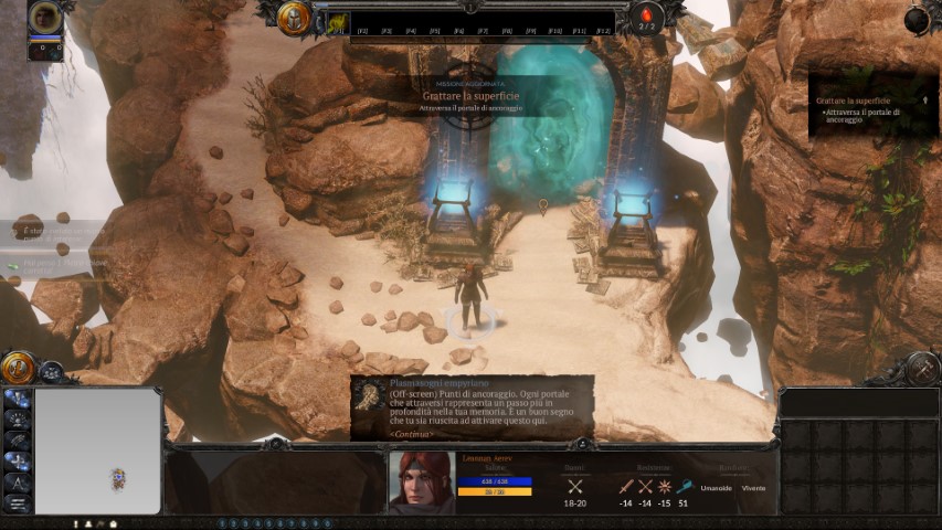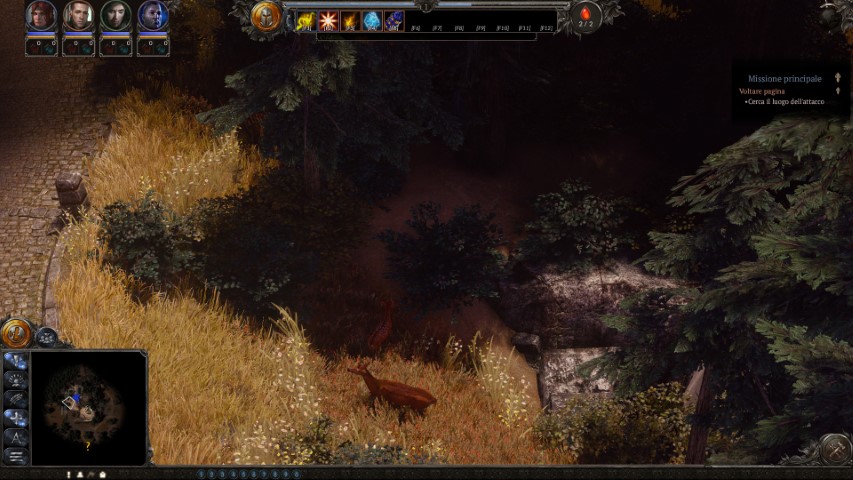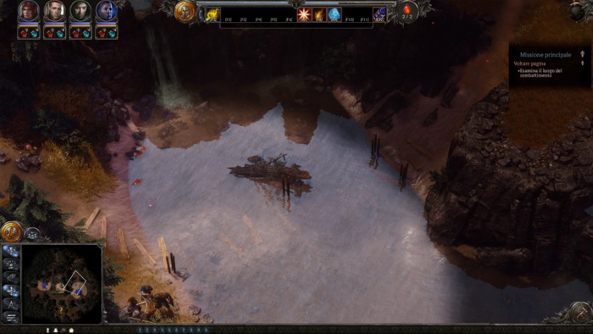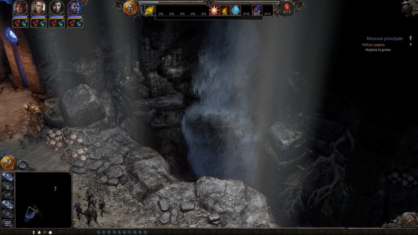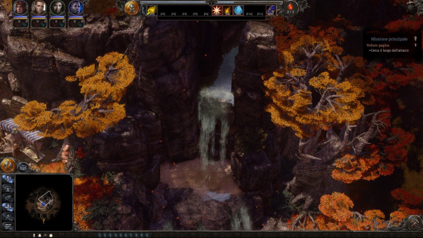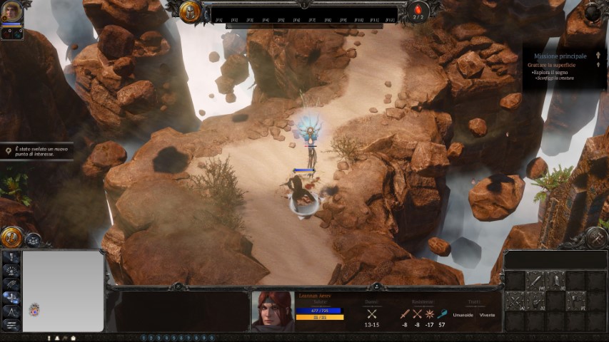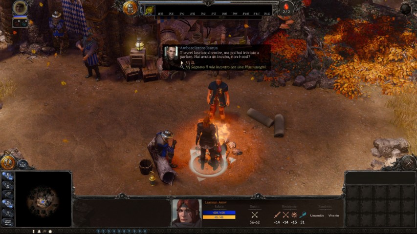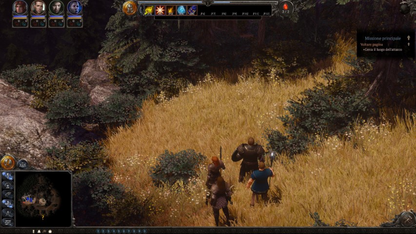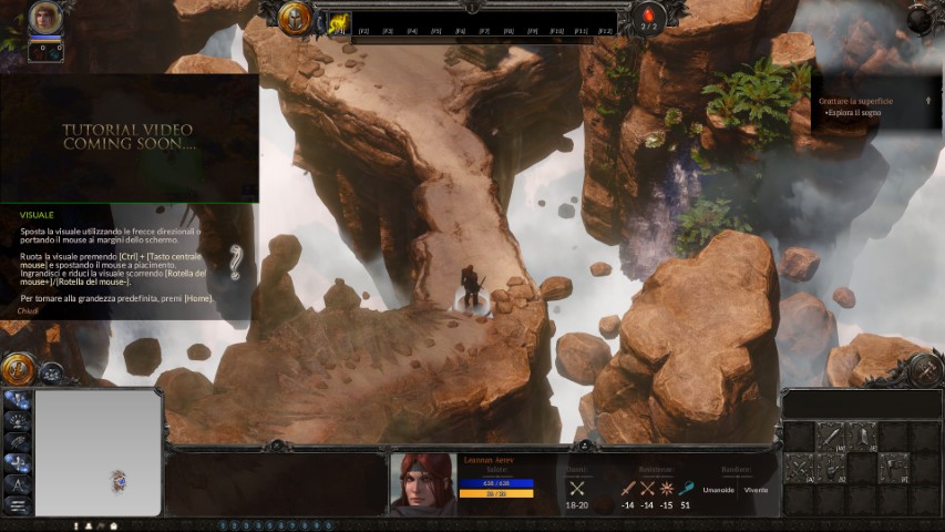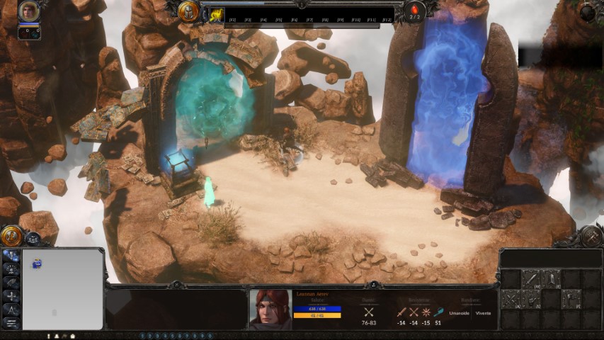 L’inizio della nostra avventura, seguirà una robusta fase di tutorial. Le meccaniche che fanno da base al gioco sono in realtà piuttosto semplici. L’interfaccia pone in alto a sinistra i ritratti dei vari personaggi che comporranno il nostro party, mentre la barra delle abilità sarà ben distinguibile in alto. Tramite i tasti F1-F12 potremo sfruttare le varie abilità, mentre in basso a destra avremo i comandi relativi ai movimenti e alla modalità “in combattimento”. In basso a sinistra, una pratica mini mappa ci informerà sul territorio da noi esplorato, e in basso, l’HUD dove sono riepilogate le statistiche sui danni e le varie resistenze del personaggio che è attualmente selezionato.