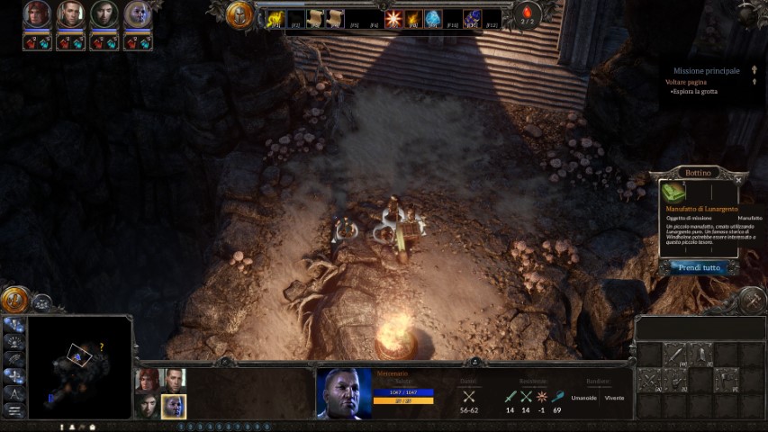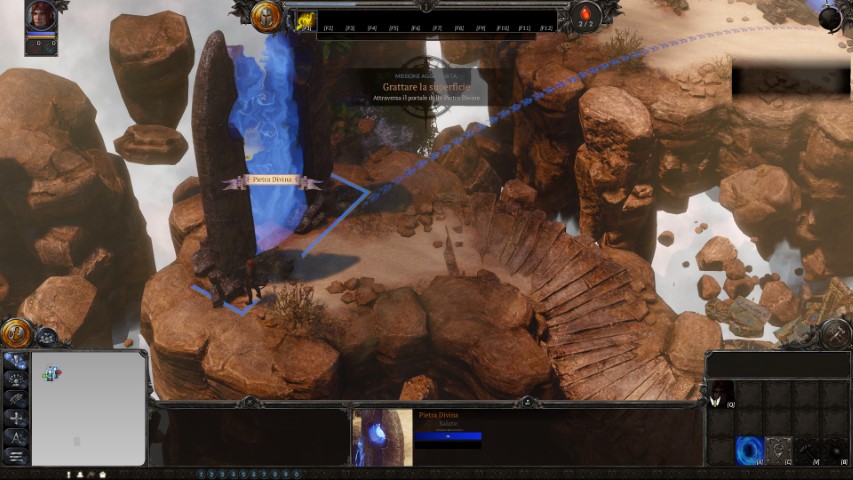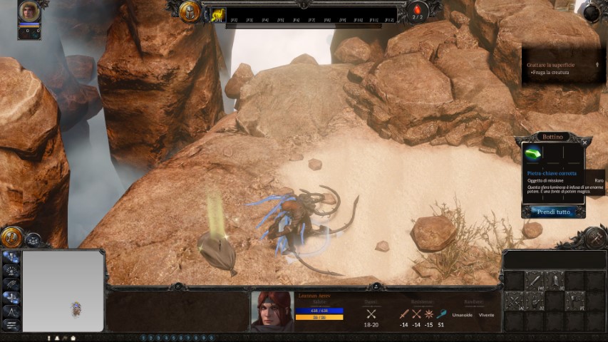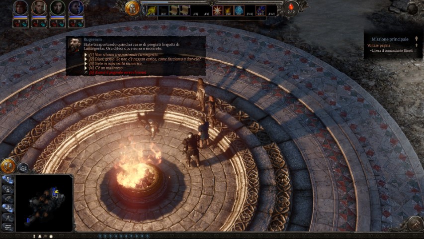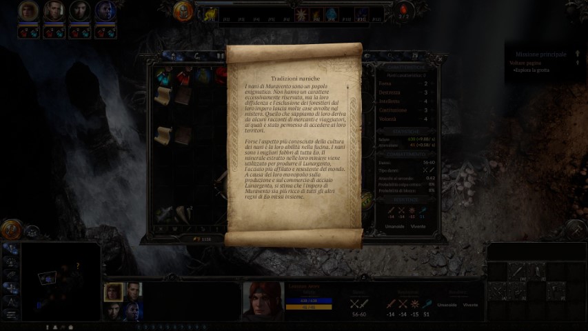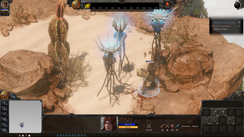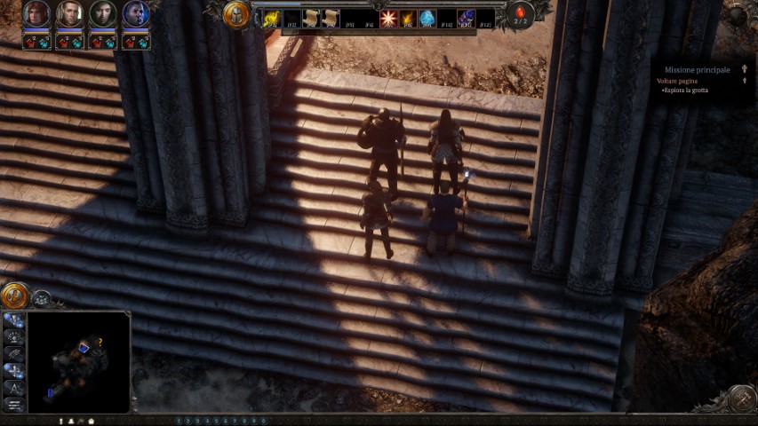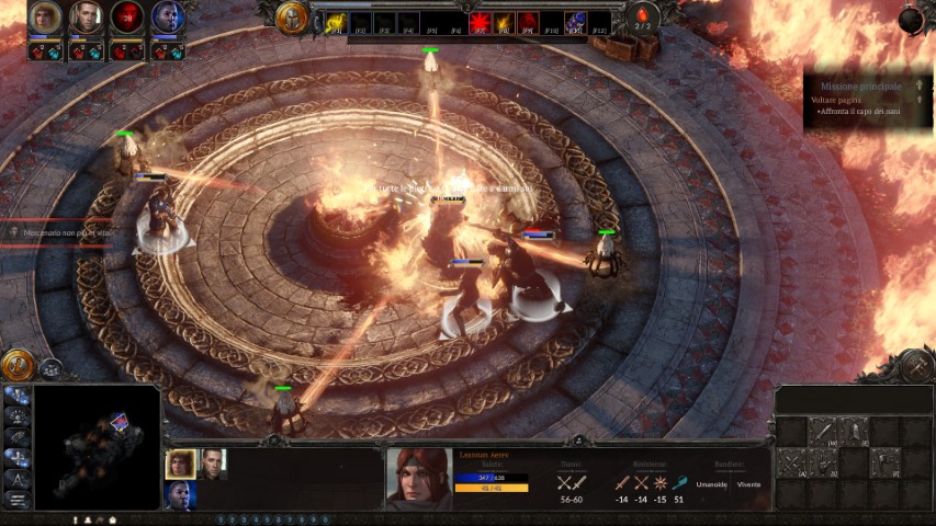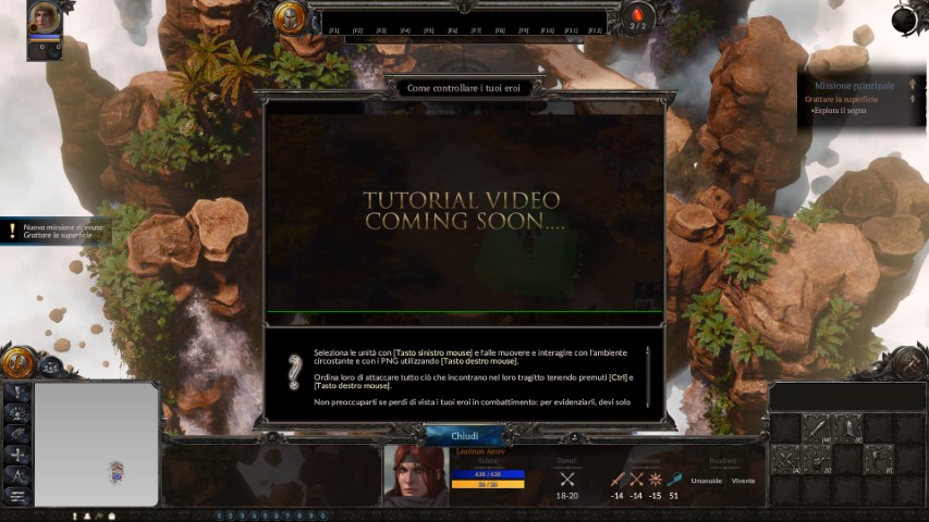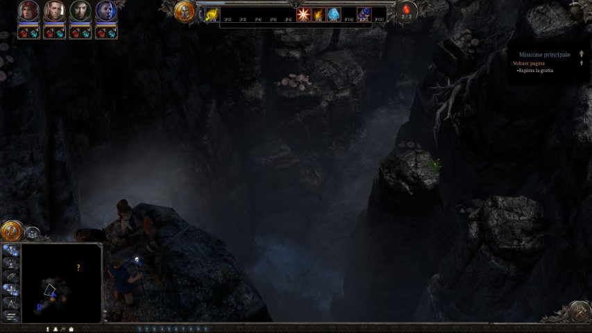 L’inizio della nostra avventura, seguirà una robusta fase di tutorial. Le meccaniche che fanno da base al gioco sono in realtà piuttosto semplici. L’interfaccia pone in alto a sinistra i ritratti dei vari personaggi che comporranno il nostro party, mentre la barra delle abilità sarà ben distinguibile in alto. Tramite i tasti F1-F12 potremo sfruttare le varie abilità, mentre in basso a destra avremo i comandi relativi ai movimenti e alla modalità “in combattimento”. In basso a sinistra, una pratica mini mappa ci informerà sul territorio da noi esplorato, e in basso, l’HUD dove sono riepilogate le statistiche sui danni e le varie resistenze del personaggio che è attualmente selezionato.
