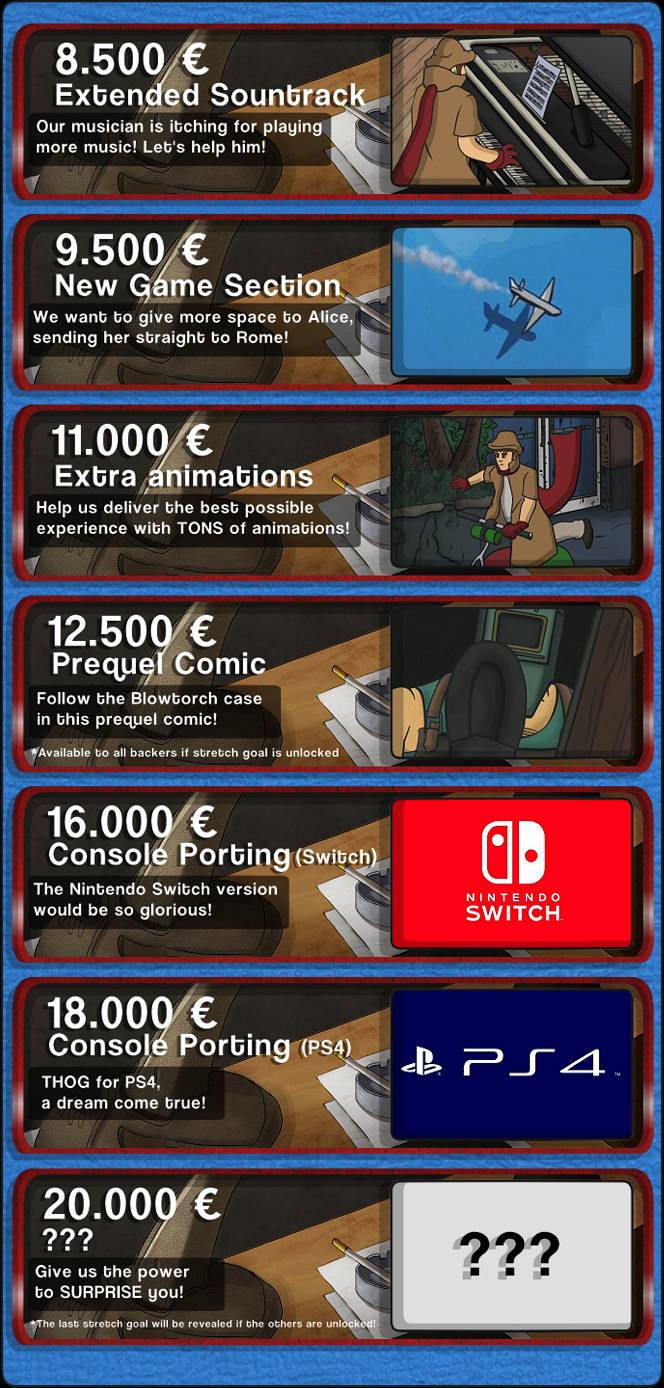 Sono, inoltre, stati già resi noti gli stretch goal,s ossia gli obiettivi secondari dopo il raggiungimento dell’obiettivo minimo. A quota 9.500 euro è prevista una nuova sezione di gioco. Ad 11.000 euro ci saranno animazioni aggiuntive. Con 12.500 euro ci sarà il prequel in fumetto, a 16.000 euro la versione Switch, a 18.000 l’edizione per PS4 ed a 20.000 una sorpresa.