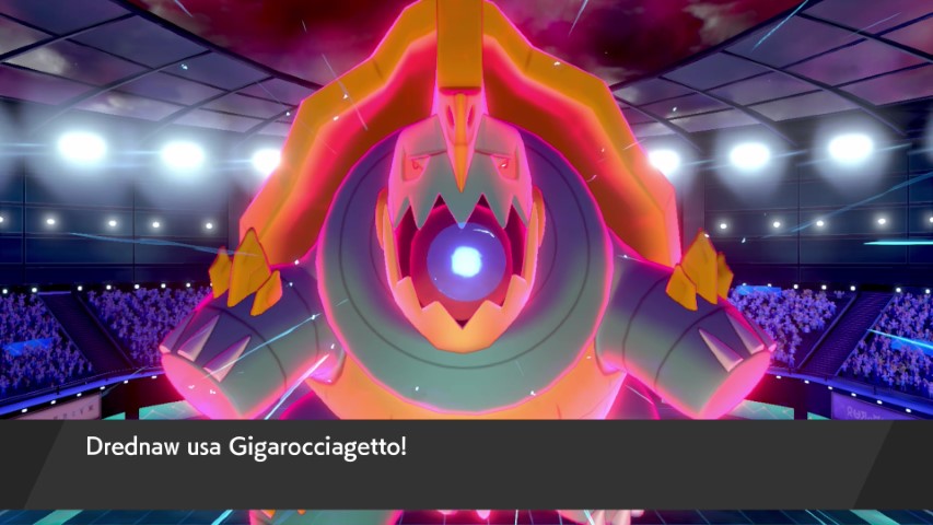 Il potente effetto del Gigamax gli permette di stare ritto sulle zampe posteriori, rendendolo bipede! Con il vantaggio della sua postura, si lancia sull’avversario schiacciandolo sotto il peso del suo corpo possente. Drednaw tiene solitamente il collo retrattile dentro la sua corazza, ma quando attacca è in grado di estenderlo rapidamente. La sua mascella è talmente potente da riuscire a fare a pezzi enormi torri di metallo. La forza della sua mascella combinata con quella del collo gli permette di perforare una montagna in un colpo solo. Drednaw Gigamax può usare Gigarocciagetto, che sostituisce tutte le sue mosse di tipo Acqua. Questa mossa, oltre a infliggere danni all’avversario, lo circonda di rocce aguzze, danneggiando anche i Pokémon che scendono in campo in seguito!
