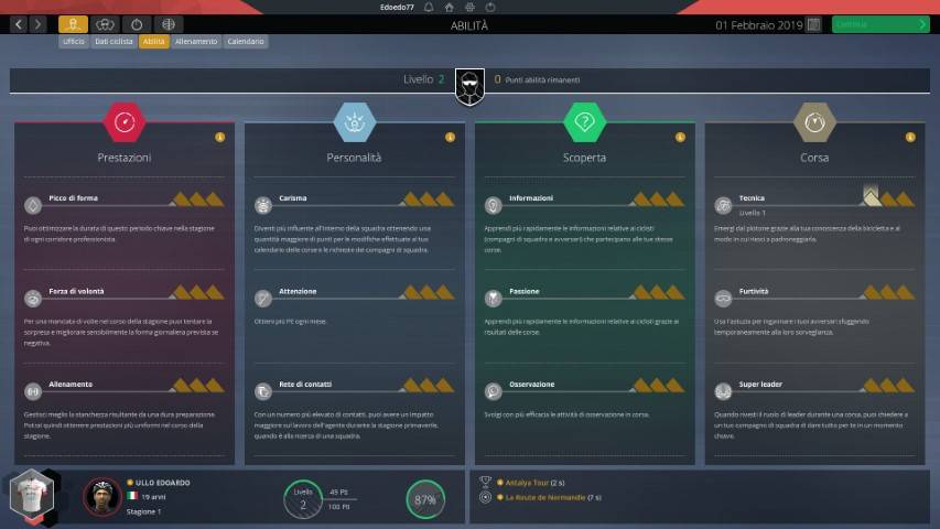 Potremo decidere se migliorare nelle Prestazioni migliorando ed aumentando il tempo del nostro picco di forma o ancora la forza di volontà o l’allenamento. La personalità sarà utile per avere carisma, o attenzione o una buona rete di contatti (questa servirà soprattutto per la gestione del contratto o avere migliori possibilità di avere un ingaggio da una squadra più importante). E così via.