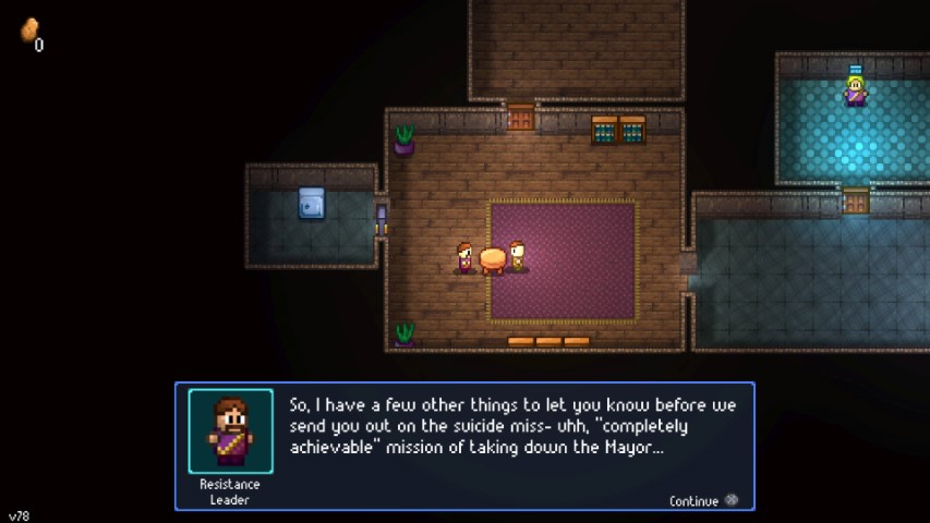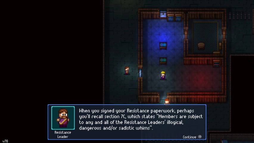Il simpatico video introduttivo, lascia il passo al capo della Resistenza che ci istruirà in un tutorial breve ma ben spiegato. Essendo una recluta, per passare al servizio attivo dovremo superare alcune prove che vanno dallo scassinare una serratura, hackerare un computer, combattere un nemico. Il tutto è scandito con un ritmo scanzonato e che si lascia volutamente prendere in giro, con battute e freddure di vario tipo a corredo di un impianto semplice ma decisamente accattivante.