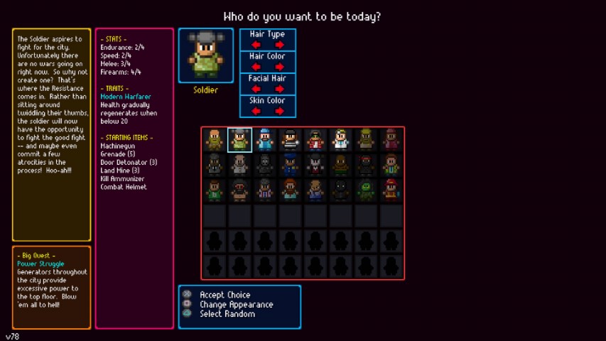 Trattandosi di un roguelike, il videogiocatore non è “bloccato” in senso stretto al personaggio scelto, ma proprio in virtù dell’alto numero di classi disponibili, sarà possibile giocare con un personaggio differente ogni volta. Se questo va a minare in parte l’immedesimazione tipica dei giochi di ruolo, dall’altro rende il tutto più scanzonato e “leggero”, tanto quanto il ritmo e il background di questa produzione.