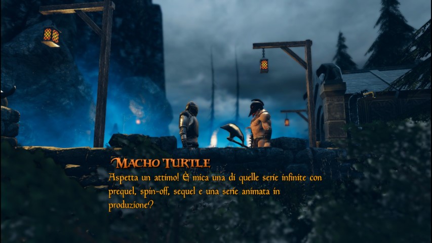 Altro personaggio importante è la Voce Narrante, che non si capisce se sia frutto dell’immaginazione di Rusty (e dei giocatori, visto che sicuramente l’avrete sentita anche voi… vero? O_o?) o cos’altro. Parla sempre in maniera distaccata ma dà utili consigli, soprattutto all’inizio. Poi avete già incontrato Macho Turtle e Roy Spidelweb. Nell’episodio 2 verrete a fare la conoscenza di un Templare – che ha vissuto un’esperienza in comune con Rusty in passato; Bill Undergrave – il guardiano della montagna del Tempio dell’Ascensione che è avvolto da un alone di mistero; Dj Superknight – tutto preso a ballare la sua musica nella Discosteria… e mercenari, fantasmi, statue, pipistrelli giganti, capitani pirati, per incontrare alla fine una importante presenza femminile (finalmente!) della quale ho già rivelato troppo.