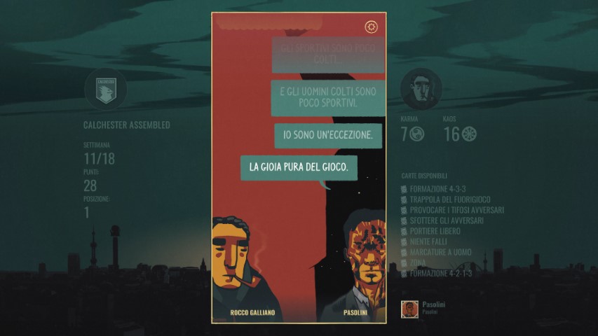 Si tratta di uno strategico-adventure molto atipico basato tantissimo sulle scelte, ricchissimo di richiami e citazioni anche al mondo del calcio reale e letterario. Tra tutti anche Pasolini ed Umberto Saba. Ne nasce un gioco molto ragionato dove le proprie scelte hanno un impatto importante sull’andamento delle partite e dell’intera stagione.