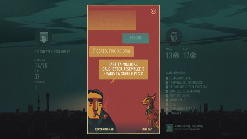 Questi due elementi saranno visualizzati perennemente. Una risposta più istintiva o brusca e vedremo anche i rapporti con stampa e persone con le quali interagiamo migliorare o peggiorare. Lungo i diciotto capitoli della nostra storia (le 18 giornate di campionato), dovremo prenderci le nostre responsabilità. Saremo integerrimi e nonostante i risultati negativi rifiuteremo aiuti di ogni genere? O saremo avidi e faremo anche delle scommesse contro la nostra squadra? Potremmo anche cercare aiuti di altro genere… Di sicuro parleremo con la nostra gatta.