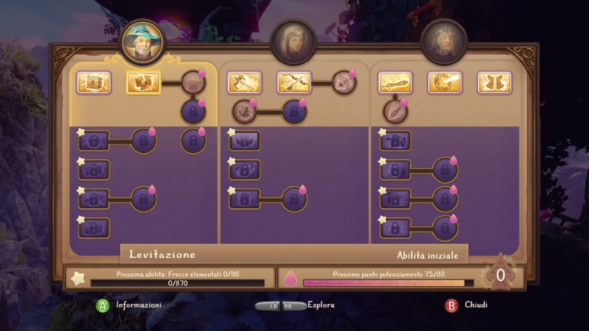 Come detto, Trine 4 avrà anche una componente ruolistica piuttosto accentuata: ricomparirà, eredità del primo e del secondo capitolo della saga, un albero delle abilità dedicato che ci consentirà di potenziare e far evolvere i nostri personaggi, donando loro abilità specifiche: ad esempio, Zoya potrà utilizzare frecce in grado di utilizzare l’elemento ghiaccio. I “punti esperienza” si raccolgono grazie a delle gocce di cristallo che raccoglieremo lungo il nostro peregrinare.