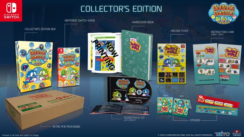 La Collector´s Edition, come prevedibile, celebrerà le origini di questa pietra miliare nella storia dei videogiochi in un modo molto speciale. Di conseguenza, conterrà numerosi articoli su Bubble Bobble e la sua storia. Contenuti che sono stati tradotti dal giapponese con grande attenzione ai dettagli per renderli accessibili a fan e collezionisti. Costerà 89,99 Euro.