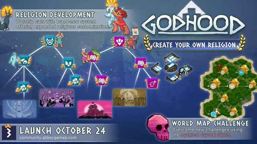 Il nuovo aggiornamento potenzia significativamente quella che è l’esperienza di base di Godhood, aggiungendo tra le altre cose anche un nuovo albero tecnologico, un restyling grafico completo e una serie di nuove opzioni di personalizzazione; in ultimo, ma non per questo meno importante: sarà presente la funzione di venerazione dei gatti e nuove meccaniche per i riti funebri (tipo che i seguaci possono decidere di cibarsi dei loro defunti).