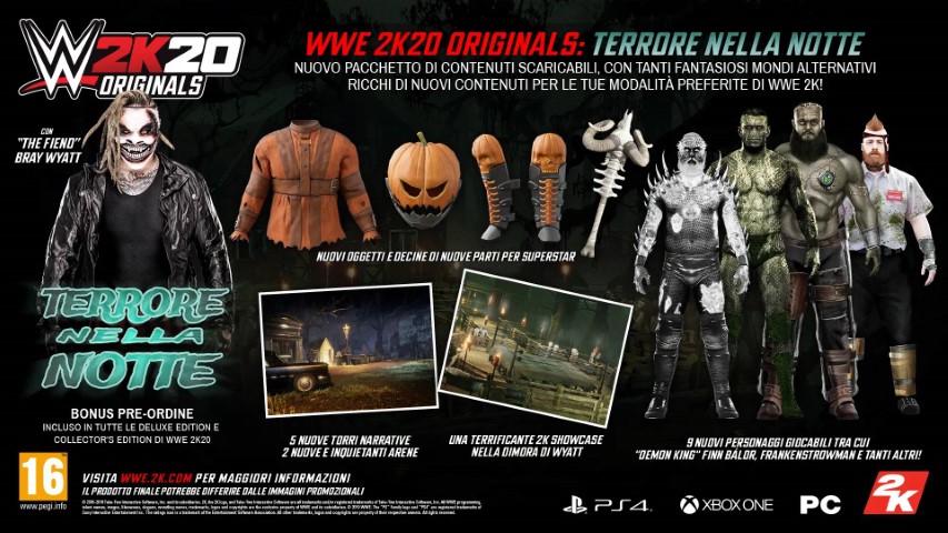 La copia del gioco in nostro possesso per la recensione era quella dell’edizione Deluxe, che tra i vari contenuti extra include anche il pacchetto WWE Bump in the night. Quest’ultimo, acquistabile separatamente da coloro che hanno invece il gioco “liscio” al prezzo di 14,90 euro circa, fa parte dei sopracitati Originals, una serie di quattro contenuti scaricabili ognuno incentrato su tematiche e ambientazioni differenti rispetto a quelle classiche del wrestling, anche fittizie.