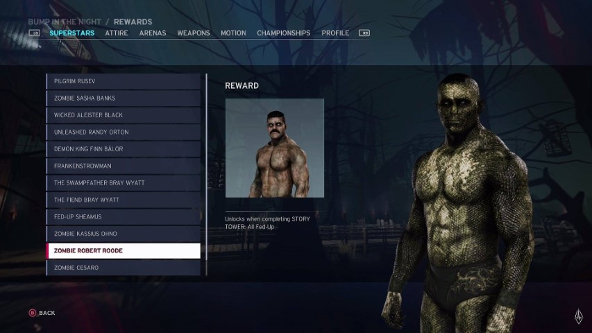 Ciascun dlc conterrà un suo Showcase e nuovi atleti, accessori e arene. Bump in the Night, nello specifico, si concentra su scenari horror, pertanto propone sfide e incontri in zone spaventose, come un ring sulla palude o un altro accanto a quella che sembra una casa stregata, con lo scarno pubblico formato da manichini e zombie, e urla che in sottofondo rompono la monotonia dei canti delle cicale o di altri animali notturni. Come se non bastasse, anche i lottatori sono versioni horror delle rispettive controparti reali, con Bray Wyatt nei panni di The Fiend, Braun Strowman in quelli di Frankenstein, Sami Zayn in versione zombi e Randy Orton trasformato in una sorta di uomo rettile, giusto per citarne alcuni.
