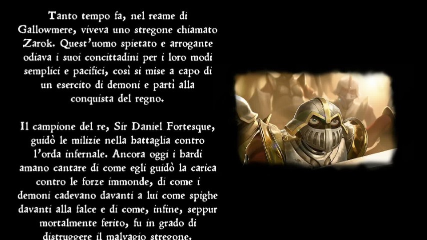 Cavaliere “per caso” durante la sua vita, il buon Dan aveva goduto da morto di una fama leggendaria grazie ai racconti dei cantastorie che ne avevano inconsapevolmente rielaborato le vicende come spesso accadeva nei secoli passati con le storie tramandate vocalmente e a cui di volta in volta ognuno aggiungeva sempre qualcosa. Tutti erano infatti convinti che fosse stato lui ad abbattere con un gesto eroico Zarok un secolo prima durante la celebre battaglia di Gallowmere, rimanendo a sua volta ucciso. In realtà Fortesque era morto praticamente a inizio scontro, colpito da una freccia a un occhio, e il malvagio stregone si era dileguato a un passo dalla sconfitta del suo esercito facendo credere a tutti di essere deceduto.